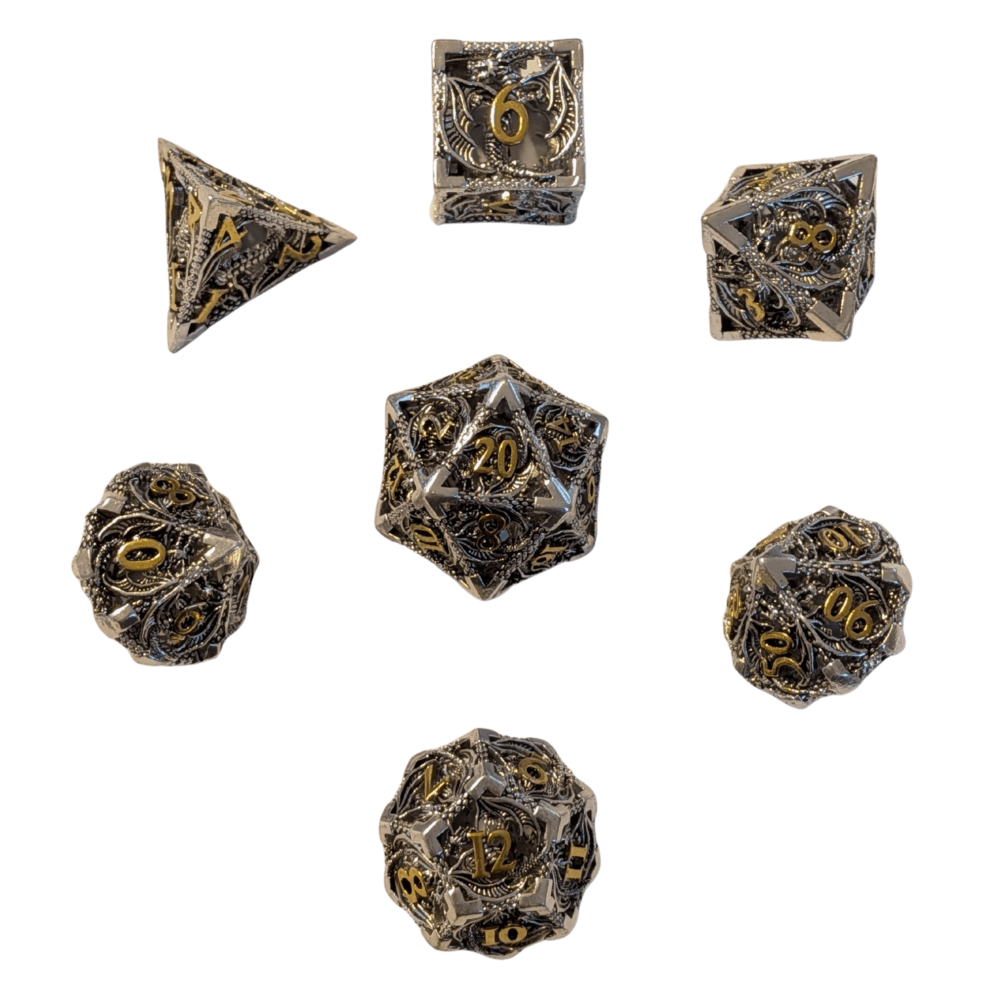 Metallwürfel mit fliegenden Drachen - Silber/Gold - 18mm Set