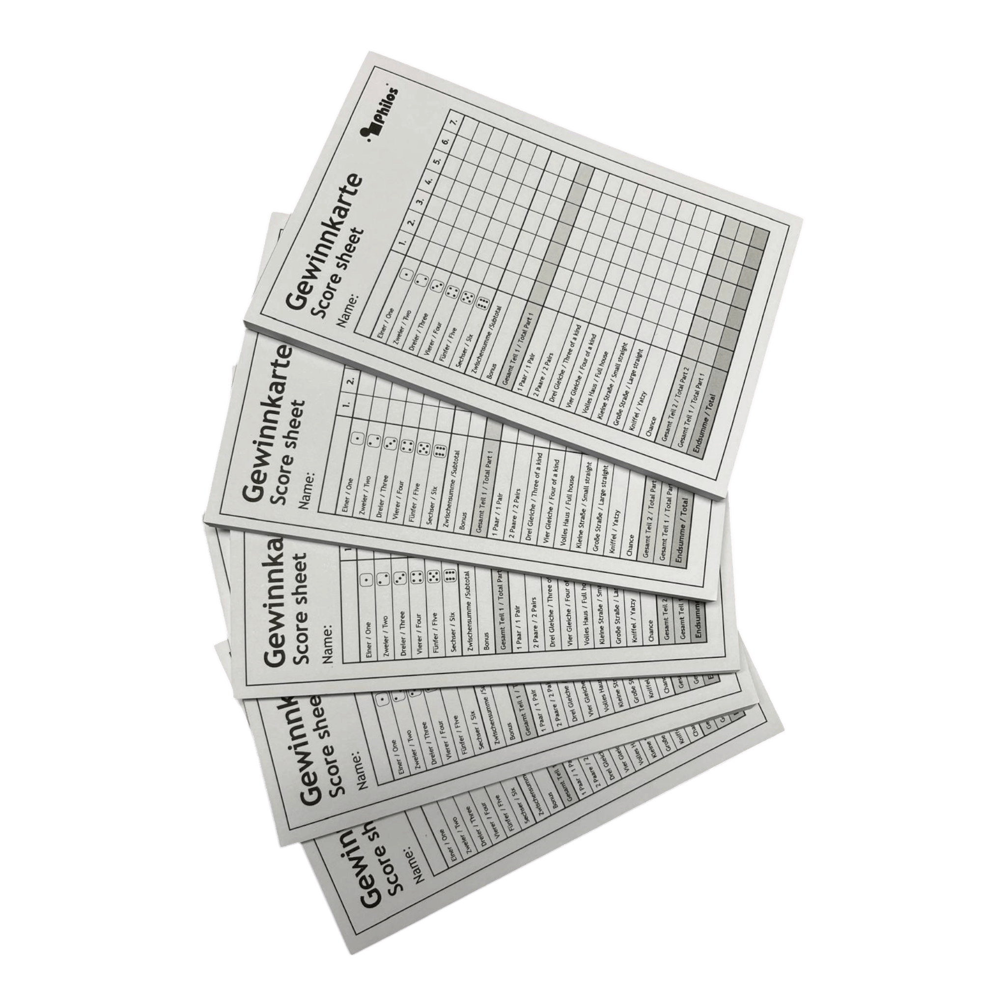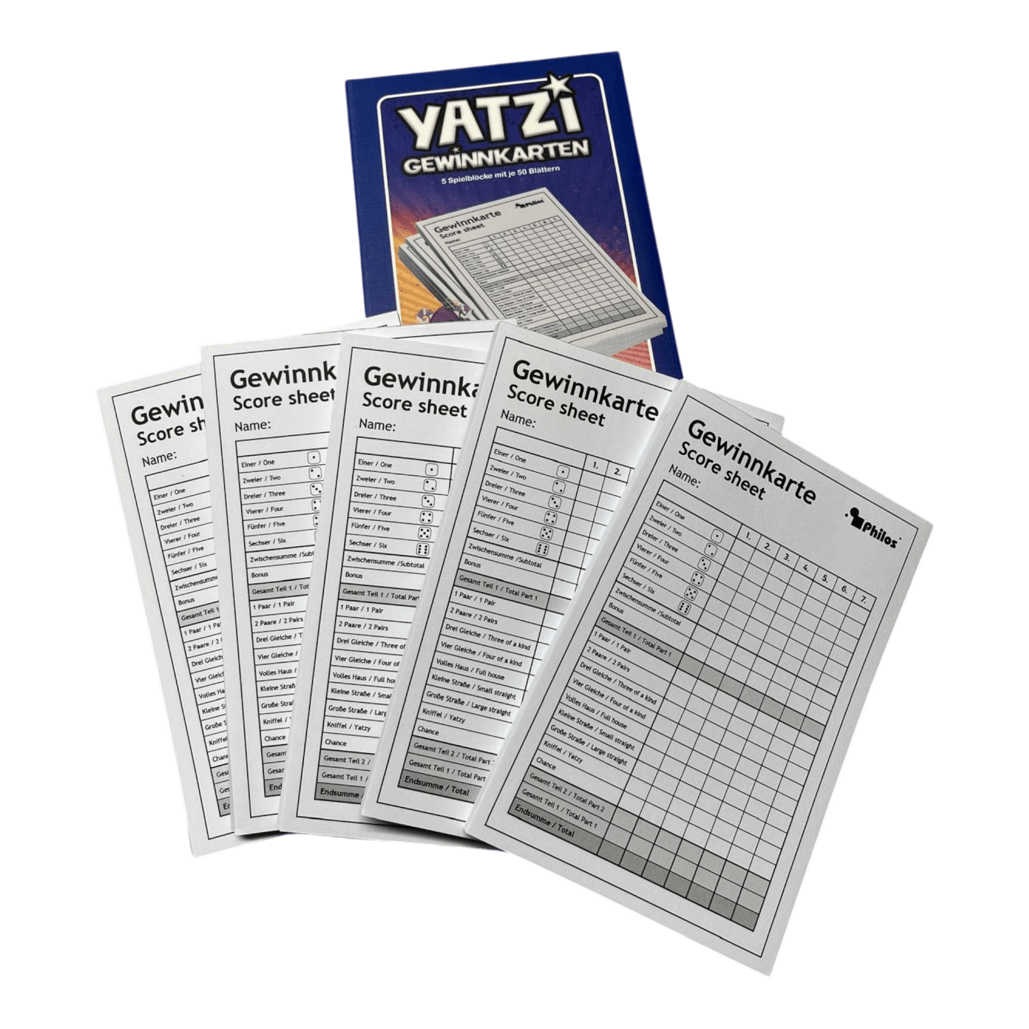 Set aus 5 Yatzy-Spielblöcke. Jeder Block enthält 60 Blatt, auf denen die Punkte für das beliebte Würfelspiel Yatzy (ähnlich wie Kniffel) festgehalten werden können. Dank des klar strukturierten Layouts behalten die Spieler jederzeit den Überblick über ihre Ergebnisse. Die Blöcke sind kompakt und leicht transportierbar, ideal für zu Hause oder unterwegs.