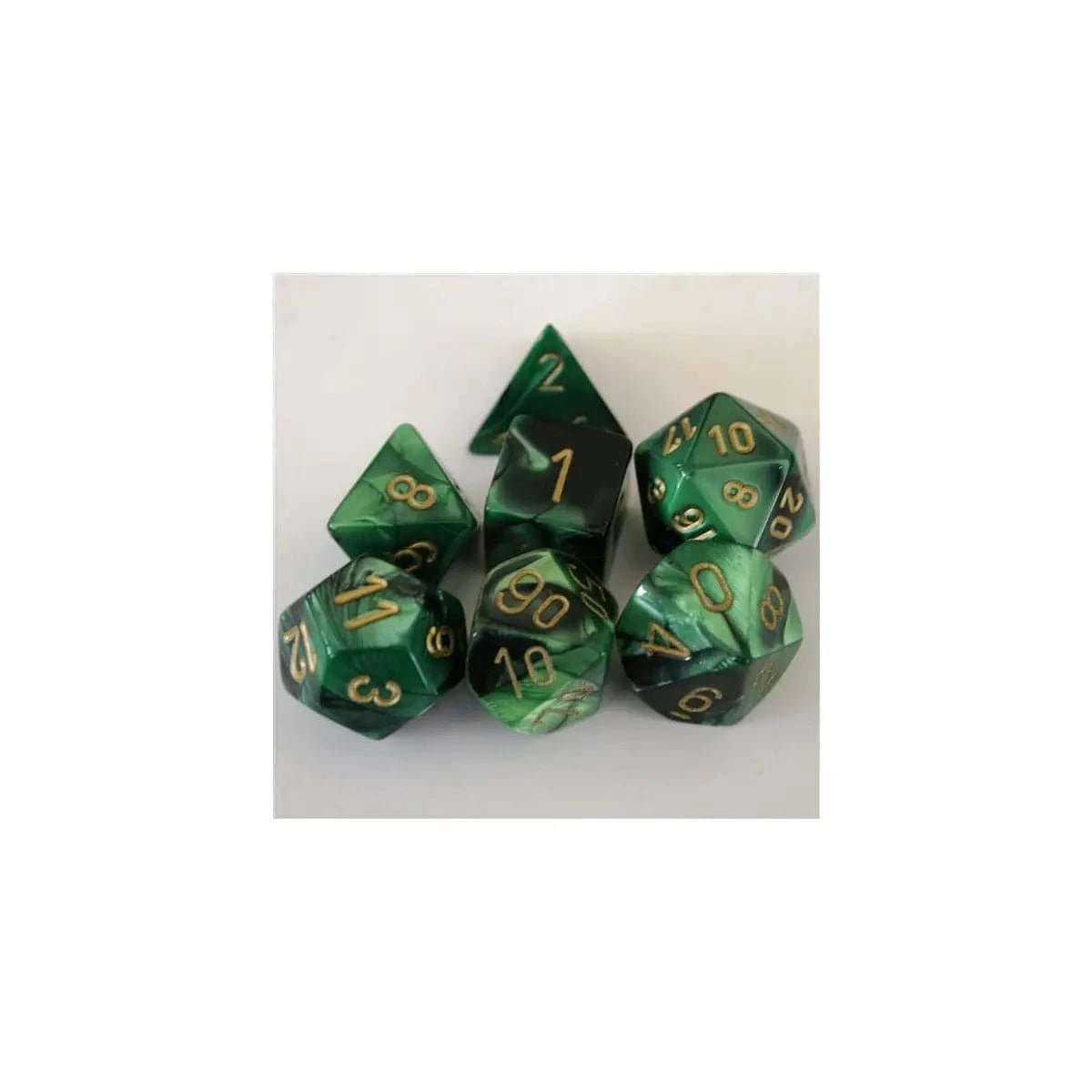 Das Chessex Gemini Black-Green Polyhedral 7er-Würfelset kombiniert Schwarz und Grün mit goldenen Ziffern für eine auffällige Optik.