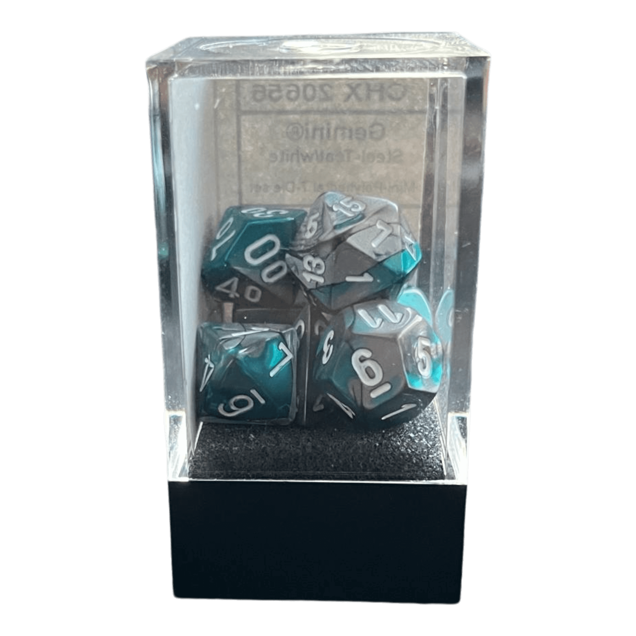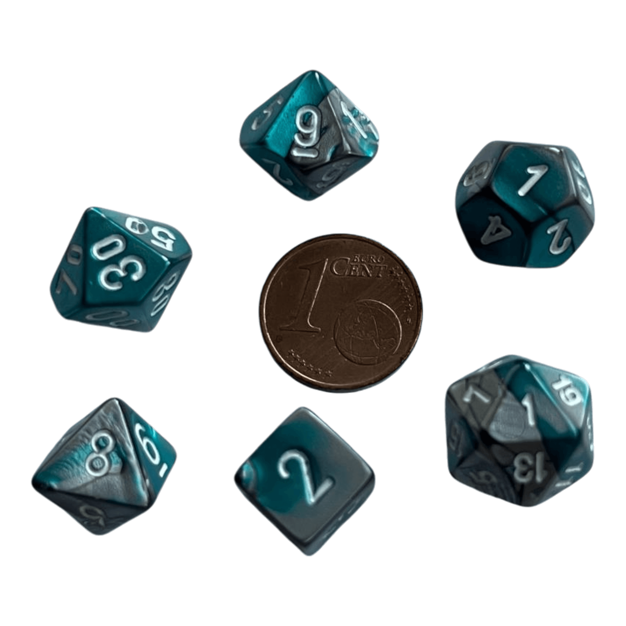 Das Chessex Gemini Steel-Teal Mini Set besteht aus 7 XS Würfeln, jeweils einem Würfel mit 4, 6, 8, 12 und 20 Seiten. Darüber hinaus beinhaltet das Set zwei Würfel mit je 10 Seiten, einmal die Zahlen 0-9 sowie einmal deren 10er Potenzen 00-90. Alle Würfel sind mit Zahlen beschriftet.