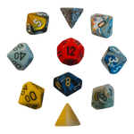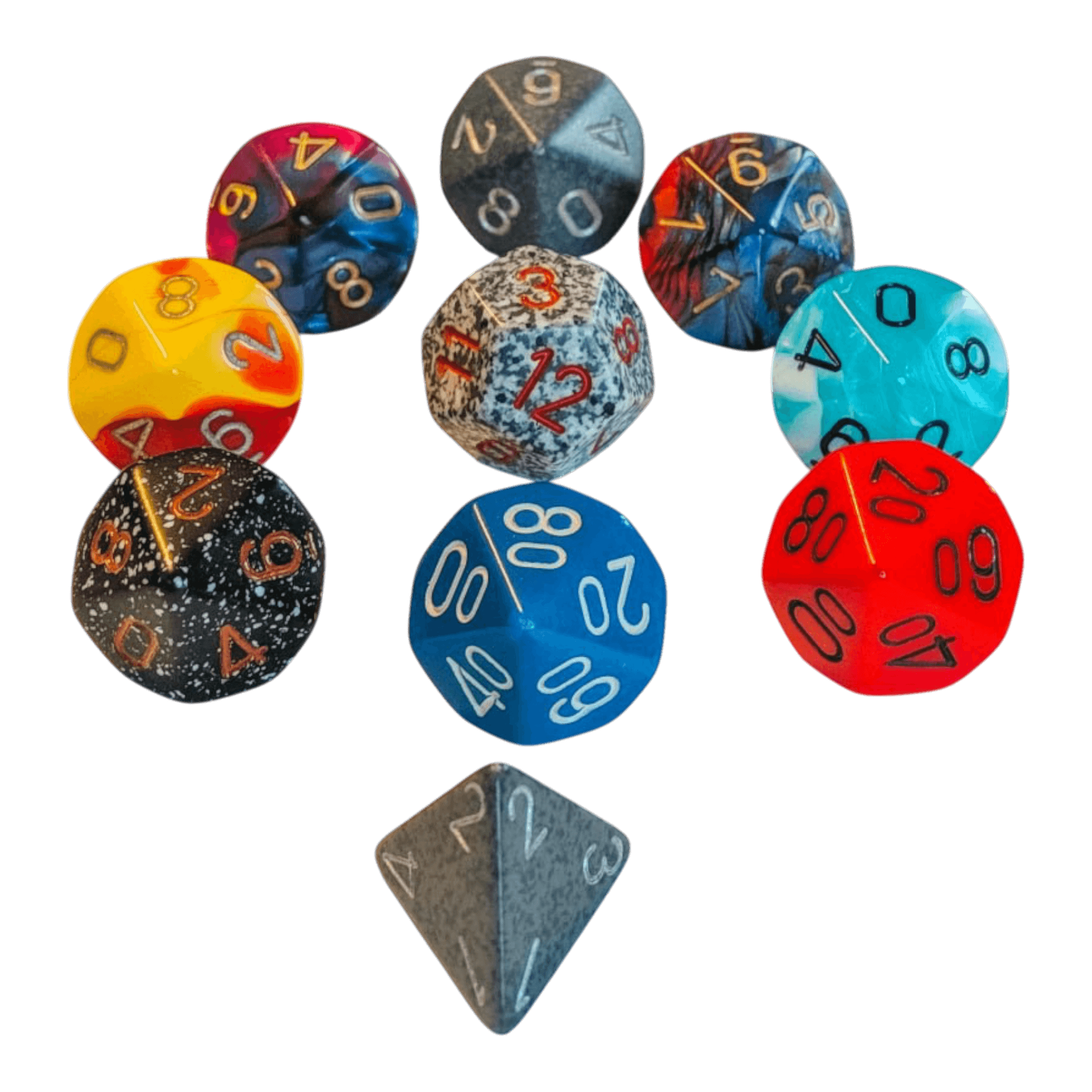 Im Set können unterschiedliche Würfeltypen enthalten sein, darunter W4, W6, W8, W10, W10-0, W12 und W20. Auch bei den Designs ist für Abwechslung gesorgt: Möglich sind Würfel aus Serien wie Opaque, Gemini, Vortex und weitere bekannte Chessex-Varianten. Jeder Würfel überzeugt durch saubere Verarbeitung, gut lesbare Zahlen und das ausgewogene Rollverhalten, für das Chessex bekannt ist.