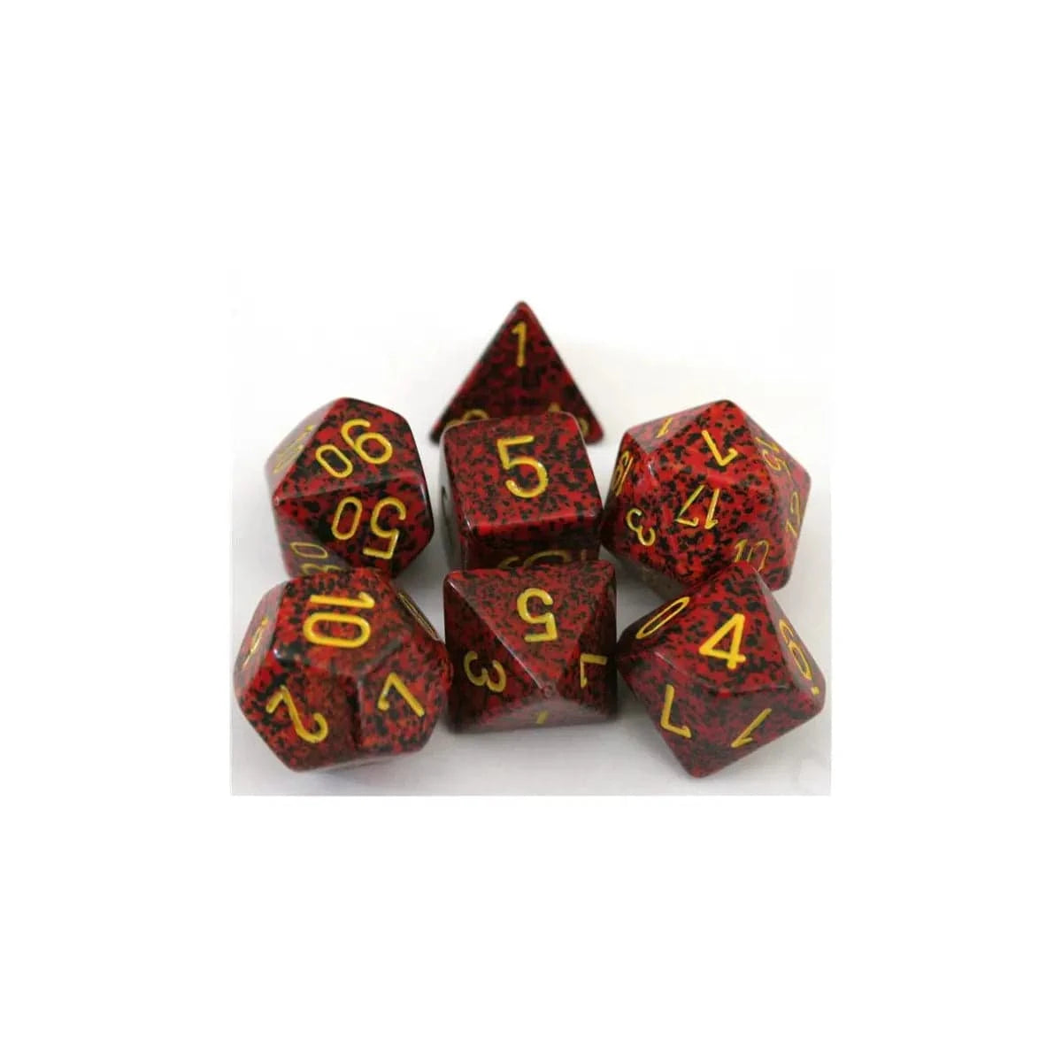 Das Chessex Speckled Mercury Würfelset vereint ein faszinierendes Design mit erstklassiger Funktionalität. Jeder Würfel im Set hat eine kräftig rote Basis, die von schwarzen Punkten gesprenkelt wird und so eine einzigartige, dynamische Optik schafft. Die leuchtend gelben Nummern setzen sich klar von der gesprenkelten Oberfläche ab und sorgen für eine ausgezeichnete Lesbarkeit. Diese Chessex Würfel bieten nicht nur eine ansprechende Ästhetik, sondern auch präzise Würfelergebnisse, die jede Spielrunde bereichern.