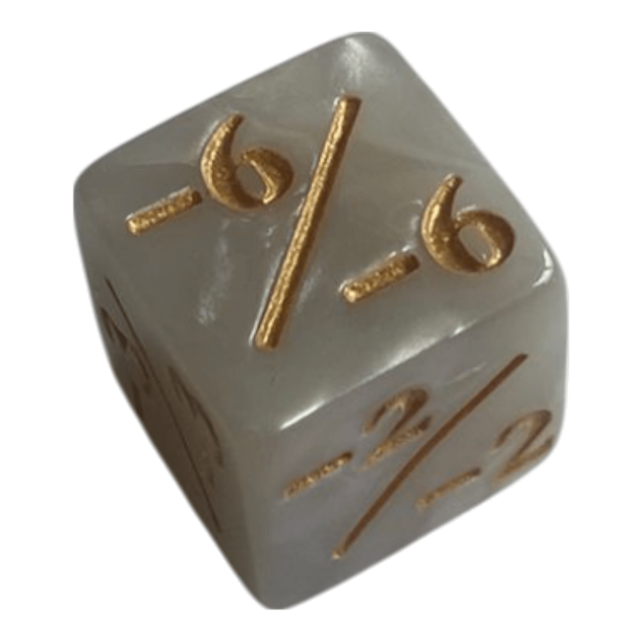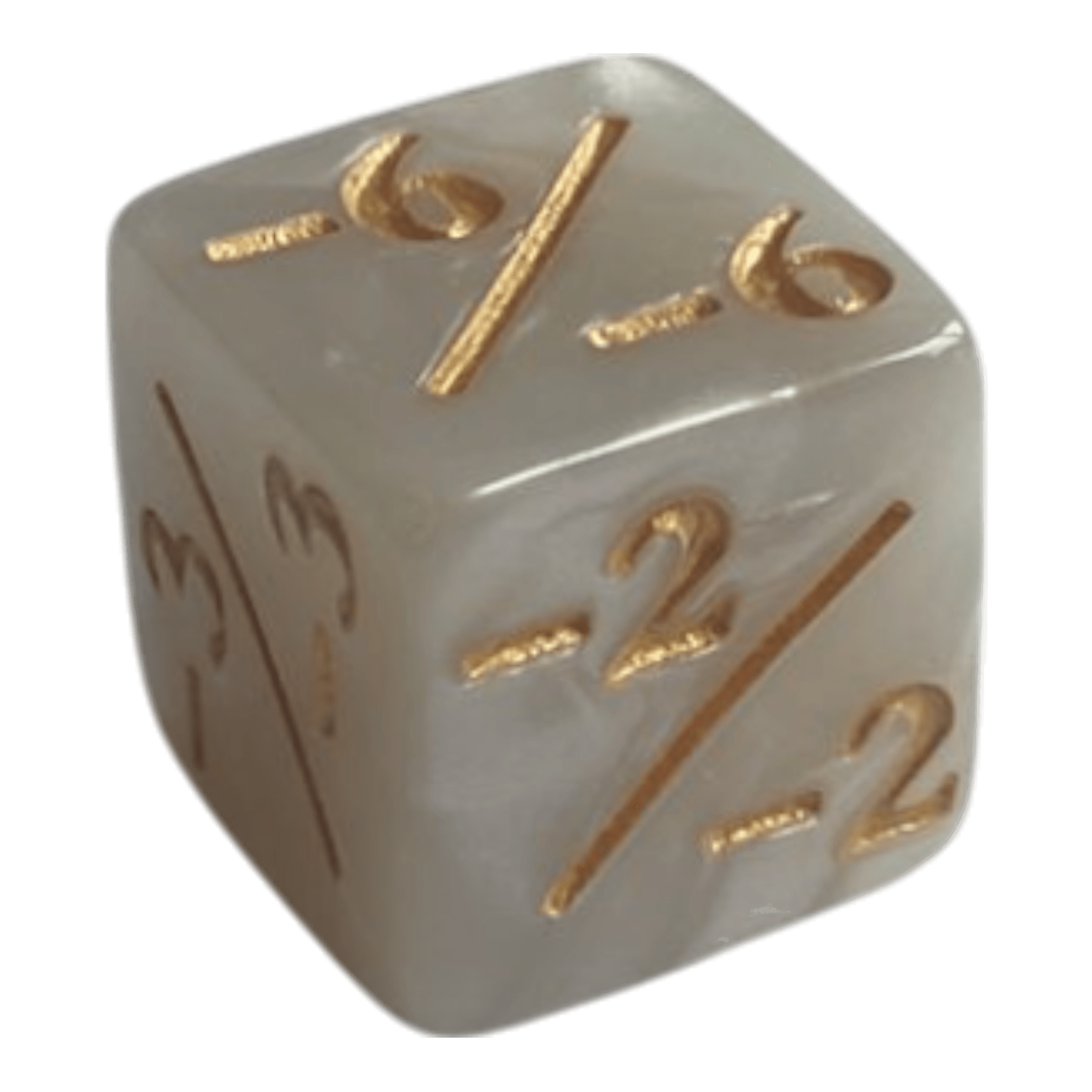 Dieser edle Counter Würfel in Perlmutt Weiß mit goldenen Zahlen ist speziell für Magic: The Gathering (MTG) und ähnliche Kartenspiele konzipiert. Mit einer Skala im negativen Bereich lässt sich der Würfel ideal einsetzen, um Lebenspunkteverluste, Marken oder sonstige Effekte übersichtlich darzustellen – besonders dann, wenn es in den kritischen Bereich geht.
