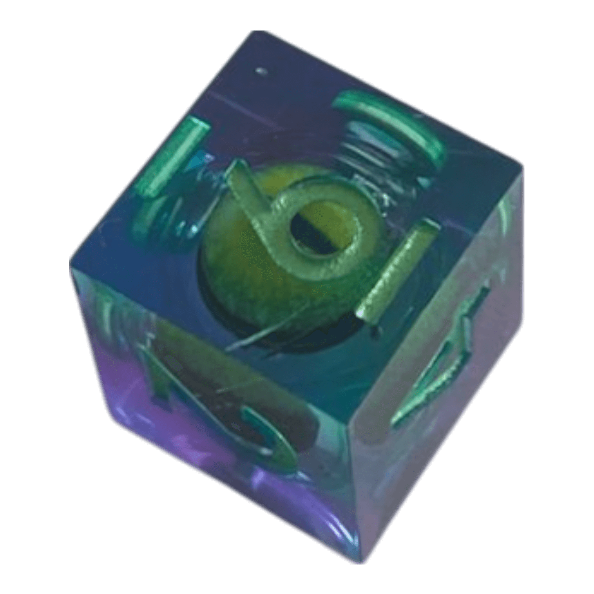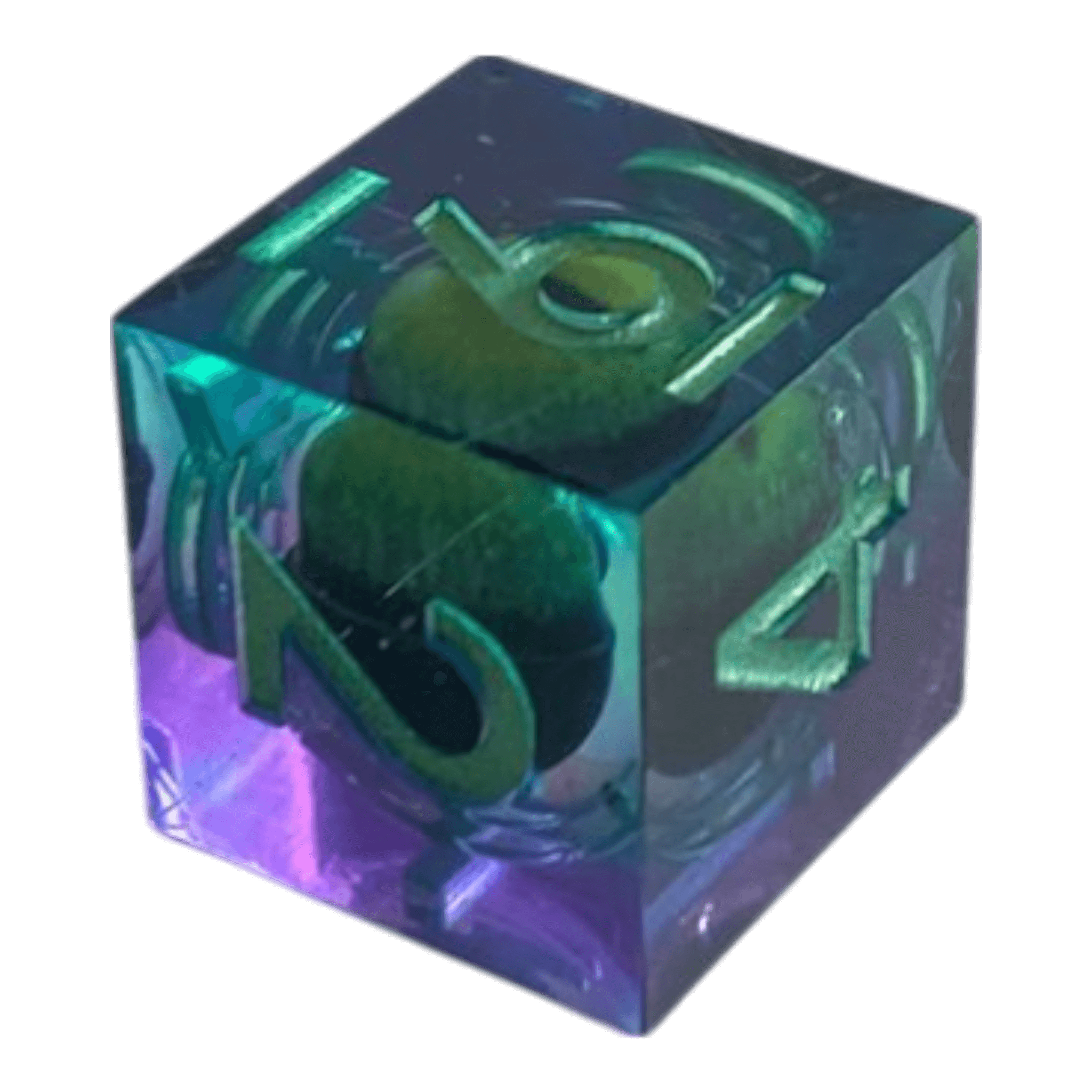Dieser W6 Drachenaugen Würfel in Blau-Lila fasziniert mit einem transparenten Würfelkörper, in dem ein fein gearbeitetes Drachenauge zu schweben scheint. Die schimmernden Farben zwischen kühlem Blau und mystischem Lila erzeugen eine eindrucksvolle Tiefe, die bei jeder Bewegung zum Leben erwacht.