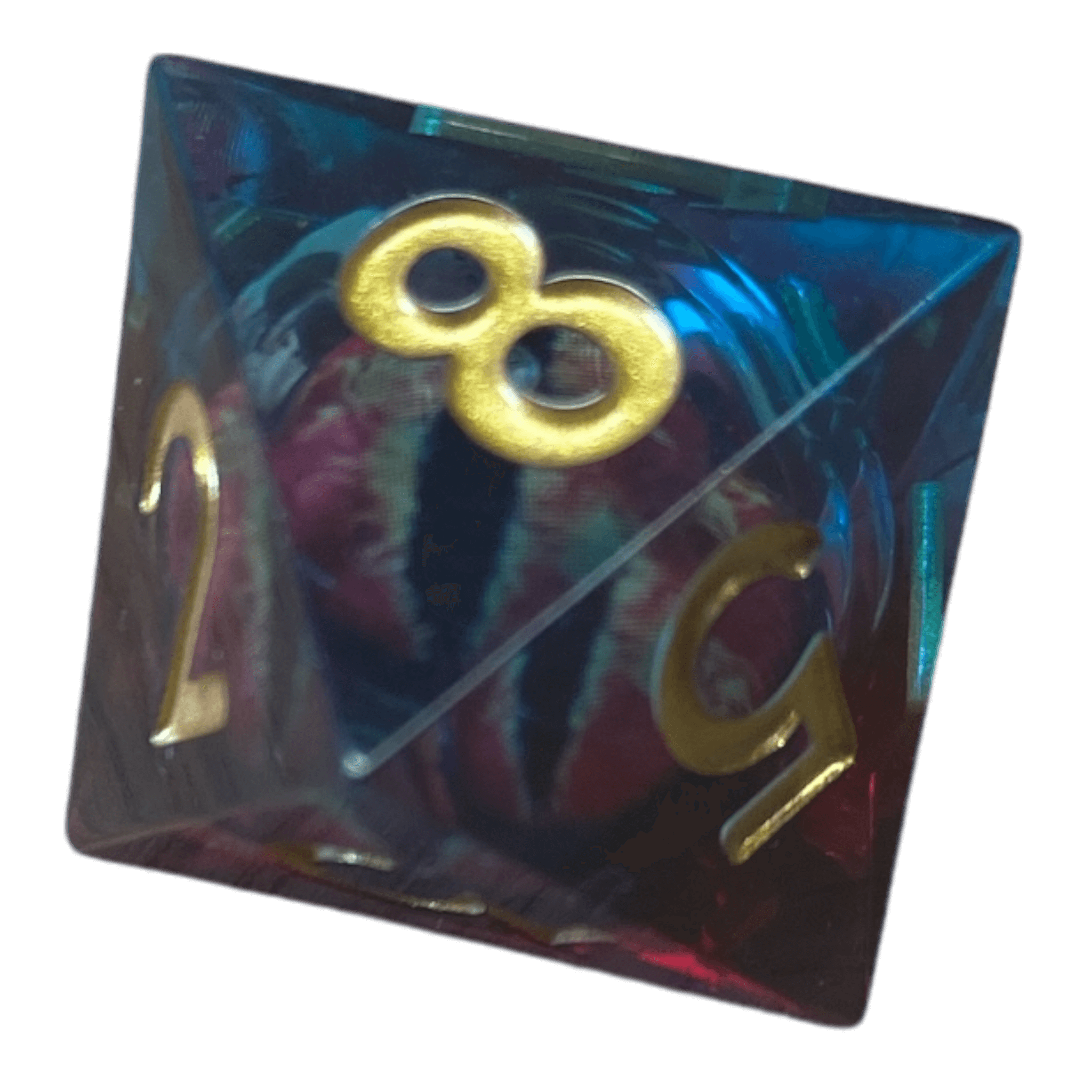 Der blaue W8 Drachenaugen-Würfel bietet eine beeindruckende Kombination aus magischem Design und dynamischer Bewegung. Im Inneren des Würfels schwebt ein Drachenauge in einer einzigartigen, zweifarbigen Flüssigkeit – ein Teil davon klar, der andere in einem intensiven Rot. Diese zweifarbige Flüssigkeit bewegt sich zusammen mit dem Auge und verleiht dem Würfel bei jedem Wurf eine fesselnde Tiefe und Lebendigkeit.