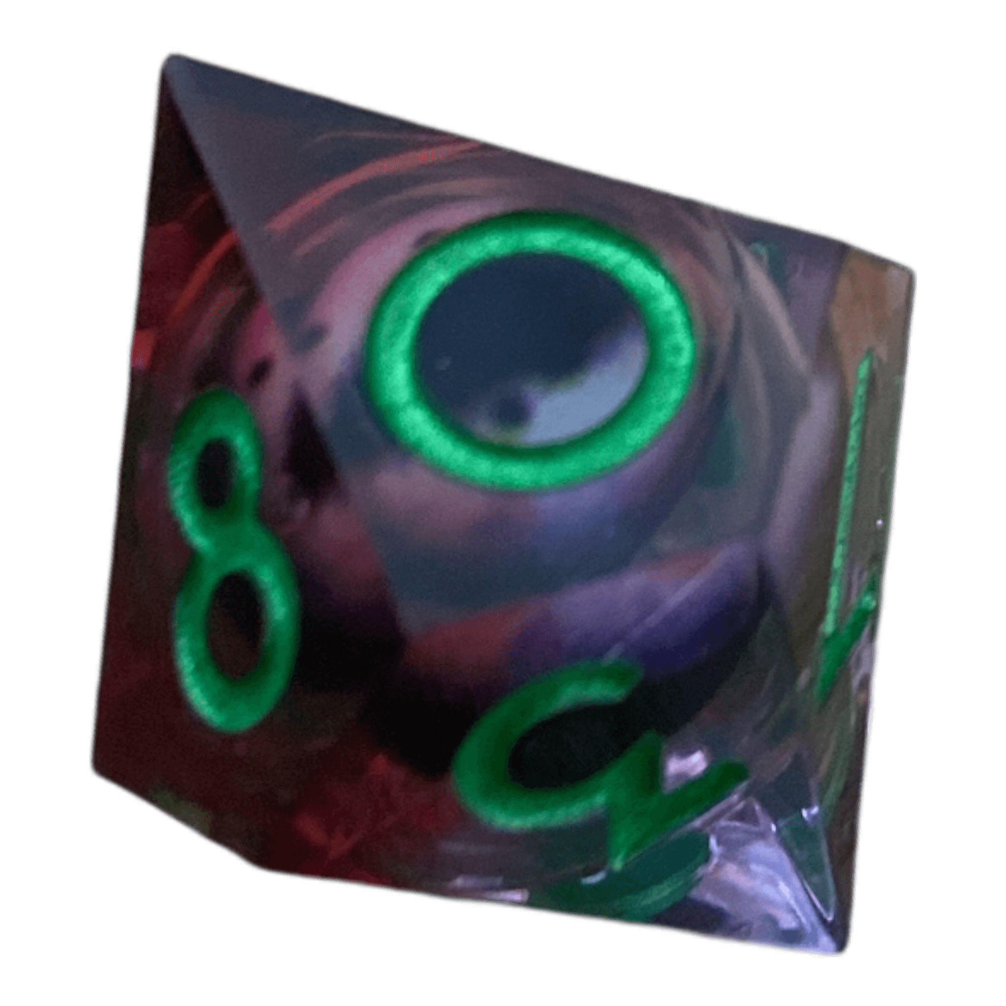 Der lila W10 Drachenaugen-Würfel vereint beeindruckendes Design und fesselnde Dynamik. In seinem Inneren befindet sich ein mystisches Drachenauge, das in einer schimmernden Flüssigkeit schwebt und sich bei jeder Bewegung lebendig mitdreht. Die tiefviolette Farbe des Würfels verstärkt den magischen Effekt und macht ihn zu einem außergewöhnlichen Blickfang auf jedem Spieltisch.