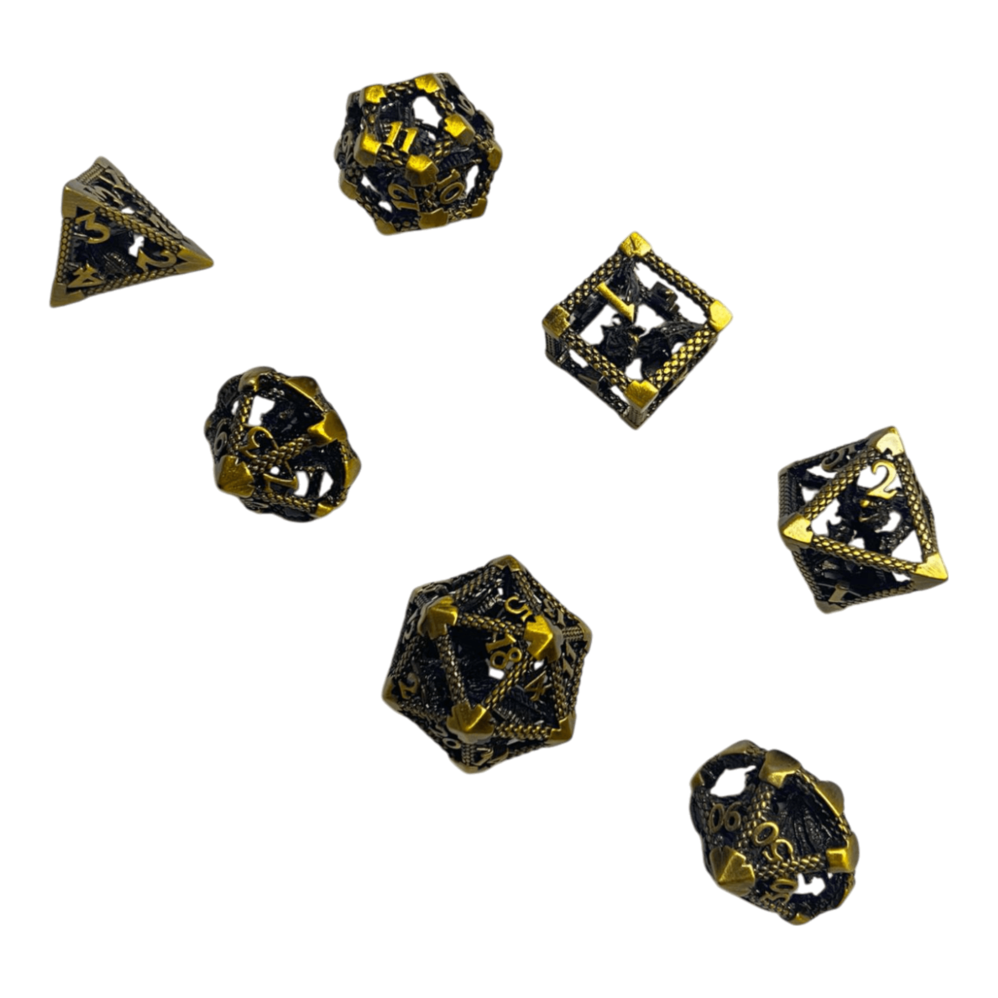 Gefertigt aus hochwertigem Metall, bieten die Drachenwürfel eine angenehme Schwere und präzise Balance für faire Würfelergebnisse. Die klaren goldenen Nummern sorgen für optimale Lesbarkeit und heben sich perfekt von der bronzenen Oberfläche ab. Ideal für Rollenspiele wie D&D, Das Schwarze Auge (DSA) oder andere Pen & Paper-Abenteuer.