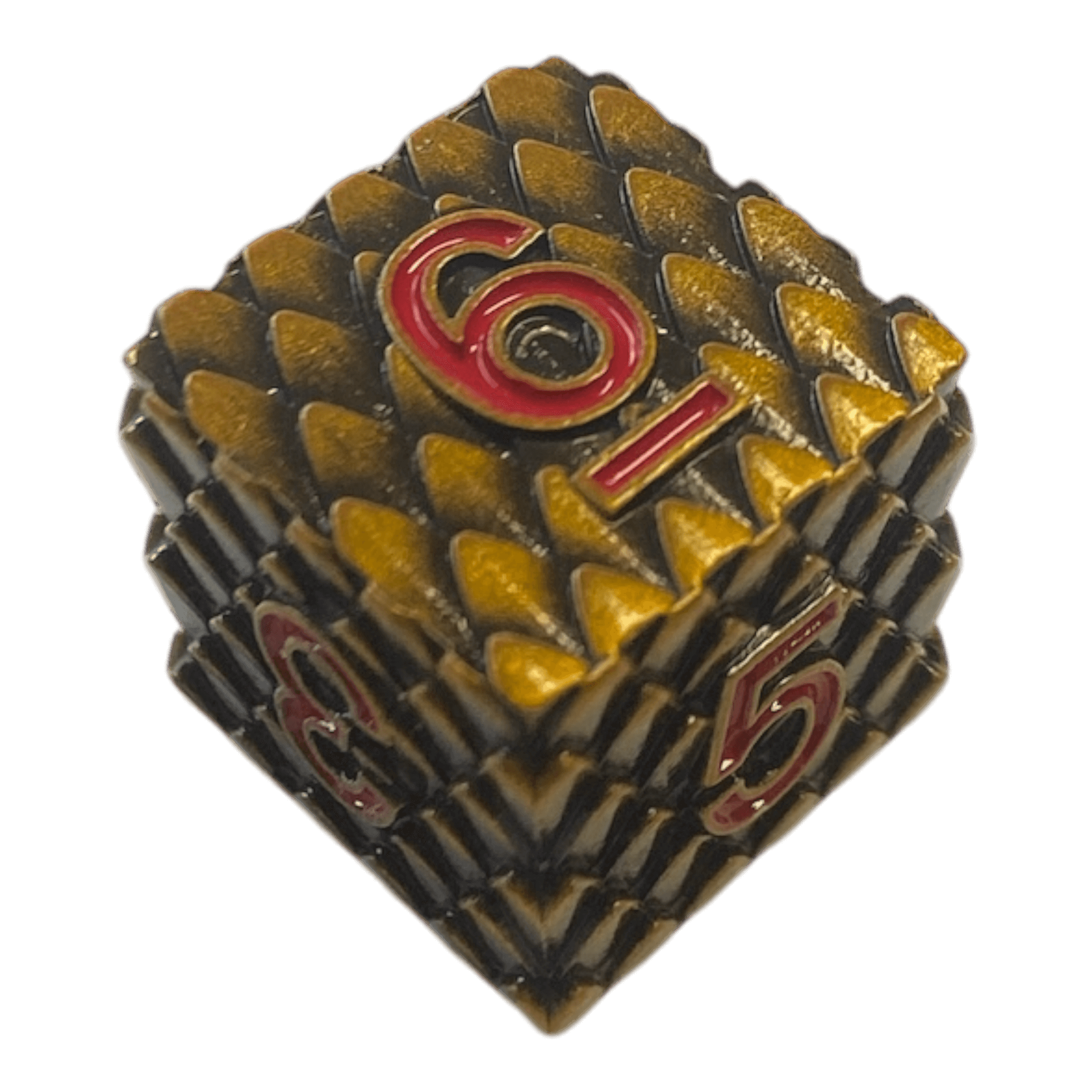 Der W6 Dragon Scale Würfel in Bronze vereint die faszinierende Optik von schimmernden Drachen-Schuppen mit erstklassiger Metallverarbeitung. Die bronzefarbenen Schuppen glänzen bei jeder Bewegung und verleihen dem Würfel eine beeindruckende Tiefe. Die hochwertige Verarbeitung sorgt dafür, dass dieser Würfel nicht nur optisch überzeugt, sondern auch präzise und langlebige Würfelergebnisse liefert.