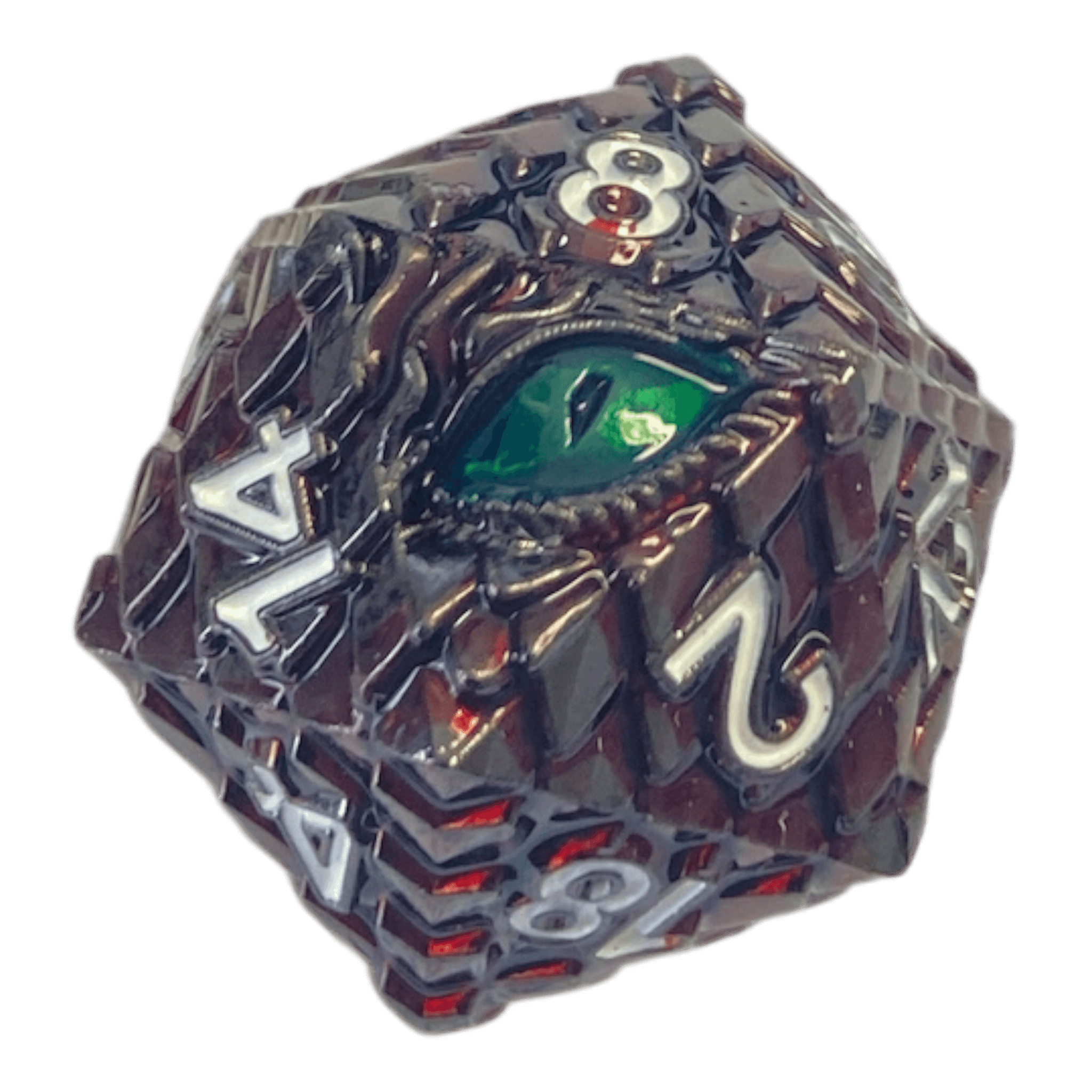 Der W20 Dragon Scale Würfel in Dunkelrot vereint Eleganz und Mystik in einem außergewöhnlichen Design. Die Drachen-Schuppen schimmern in einem tiefen Dunkelrot, das bei Lichteinfall in einen geheimnisvollen Schwarzton übergeht. Dieser beeindruckende Farbwechsel verleiht dem Würfel eine besondere Tiefe und macht ihn zu einem visuellen Highlight. Die robuste Metallverarbeitung garantiert langlebige Haltbarkeit und präzise Würfelergebnisse. Zusätzlich wird dieser W20 Würfel noch von einem grünes Drachenauge verziert.