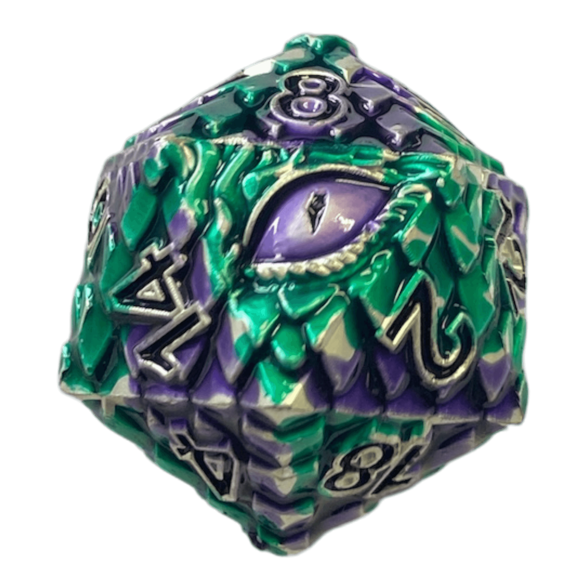 Der W20 Dragon Scale Würfel in Grün/Lila kombiniert die faszinierende Drachen-Schuppenoptik, das das Design noch magischer macht. Die in kräftigem Grün und Lila gehaltenen Schuppen verleihen dem Drachenwürfel eine außergewöhnliche Tiefe, während das lila Drachenauge das mystische Erscheinungsbild komplettiert. Gefertigt aus hochwertigem Metall, bietet dieser Würfel nicht nur visuelle Magie, sondern auch präzise und zuverlässige Würfelergebnisse.