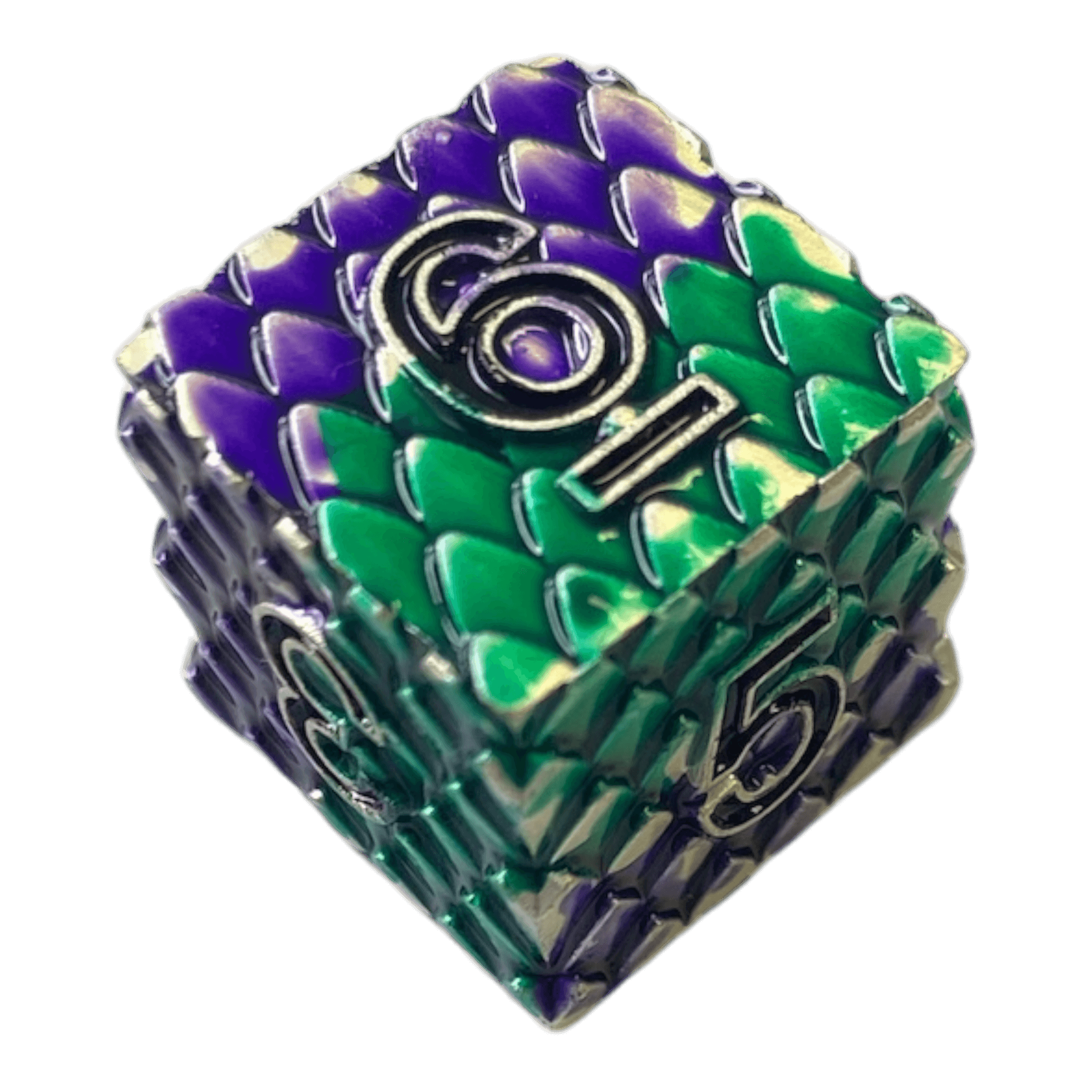 Der W6 Dragon Scale Würfel in Grün/Lila fasziniert durch seine eindrucksvolle Drachen-Schuppenoptik. Die Schuppen des Würfels leuchten in kräftigem Grün und Lila, wodurch der Drachenwürfel eine beeindruckende Tiefe und Magie ausstrahlt. Dank der hochwertigen Metallverarbeitung bietet dieser Würfel nicht nur eine fesselnde Optik, sondern auch langlebige Stabilität und präzise Würfelergebnisse.