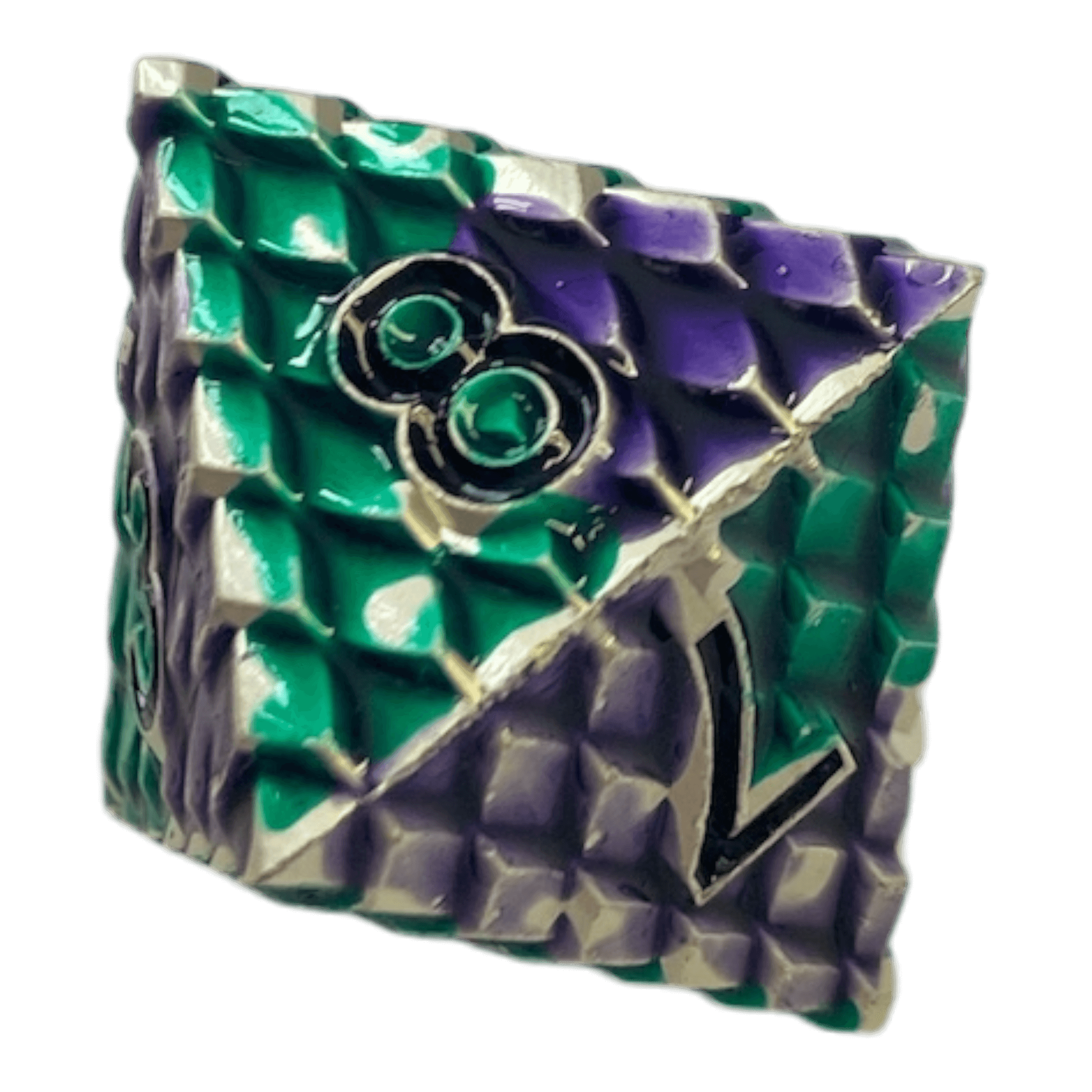 Der W8 Dragon Scale Würfel in Grün/Lila begeistert durch seine auffällige Drachen-Schuppenoptik. Die Schuppen strahlen in kräftigem Grün und Lila, was dem Drachenwürfel eine beeindruckende Tiefe und mystische Eleganz verleiht. Dank der hochwertigen Metallverarbeitung überzeugt dieser Würfel nicht nur visuell, sondern auch durch präzise und langlebige Würfelergebnisse.