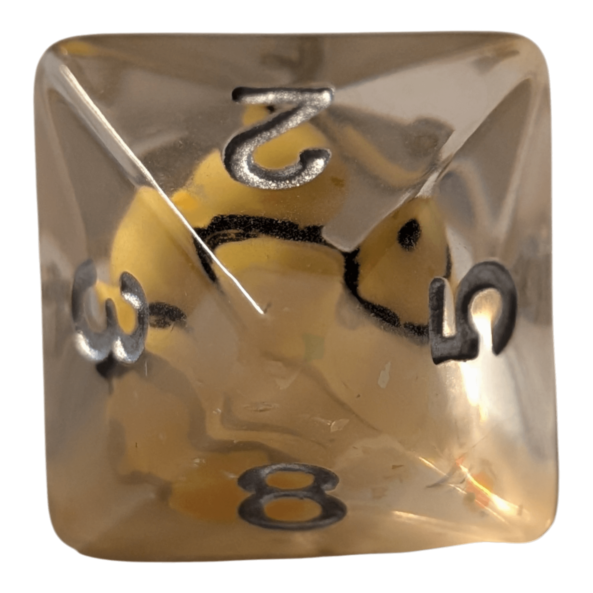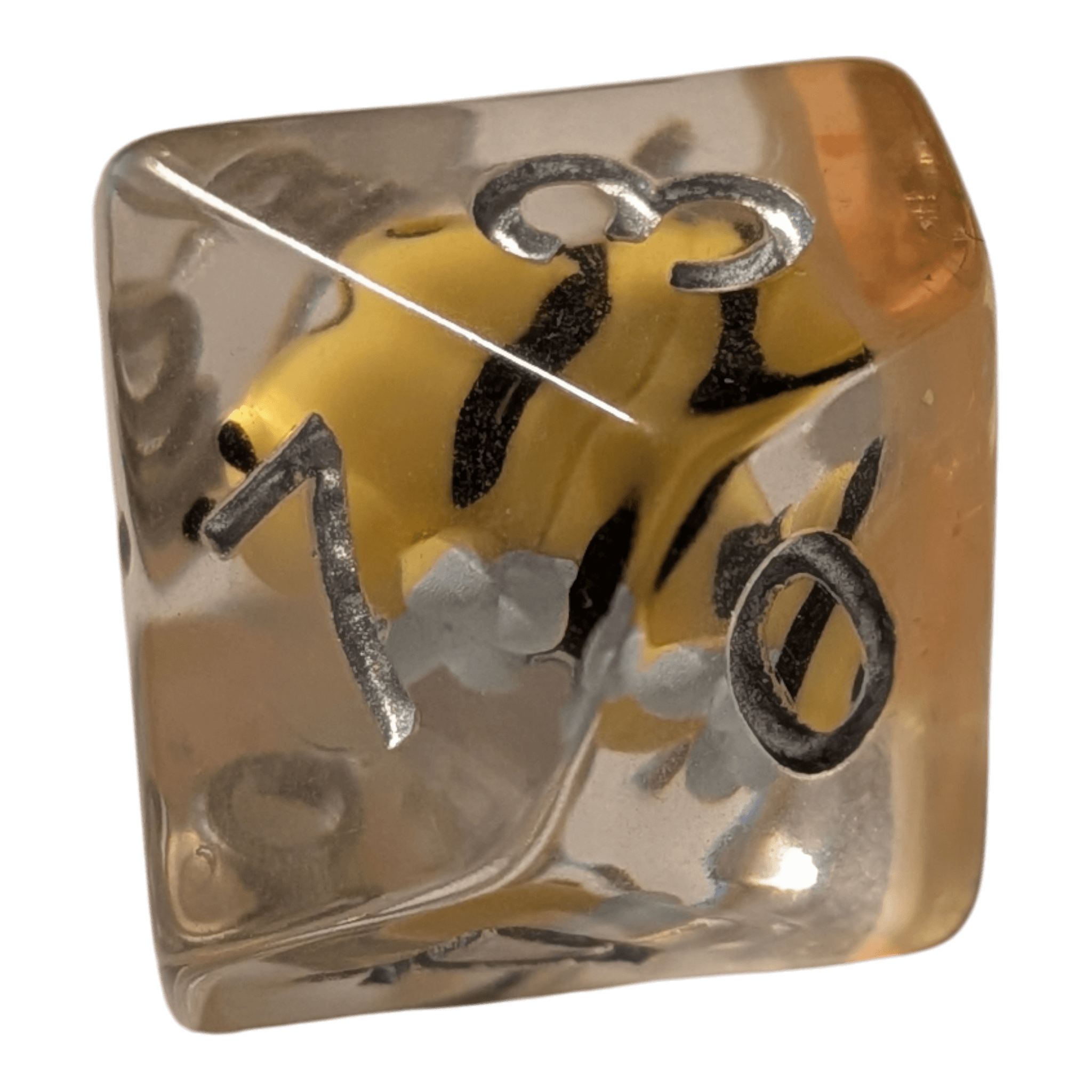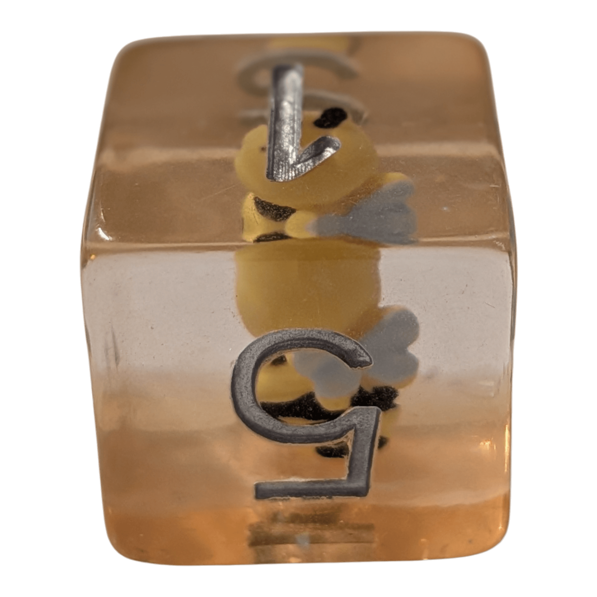 Dieses zauberhafte Würfelset bringt summende Magie auf den Spieltisch. Die transparenten Würfel enthalten liebevoll gestaltete Bienen (bee), die von feinem Glitzer umgeben sind. Bei jedem Wurf funkelt das Innere der Würfel und verleiht deinen Spielzügen eine lebendige, verspielte Optik.