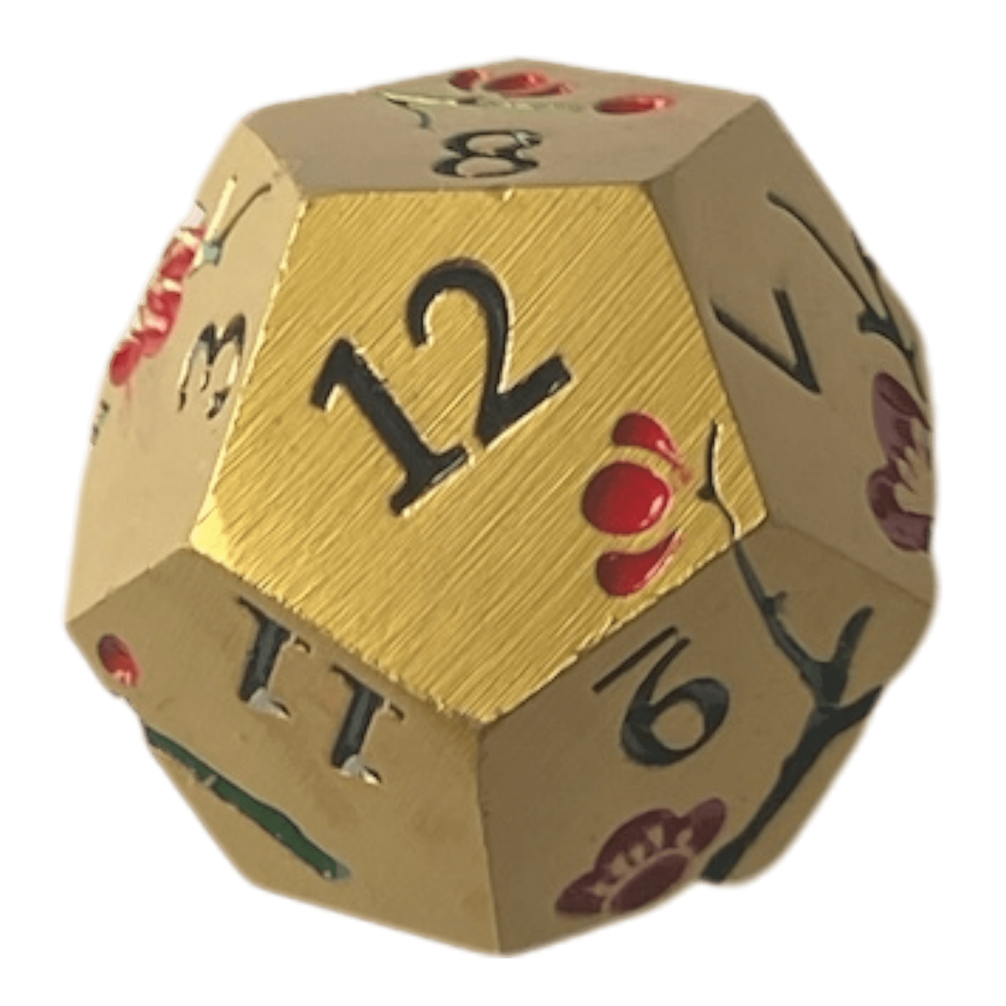 Ideal für Rollenspiele, Tabletop-Games oder als exklusives Sammlerstück – der W12 Blumen Metallwürfel in Gold kombiniert einzigartiges Design mit höchster Funktionalität.