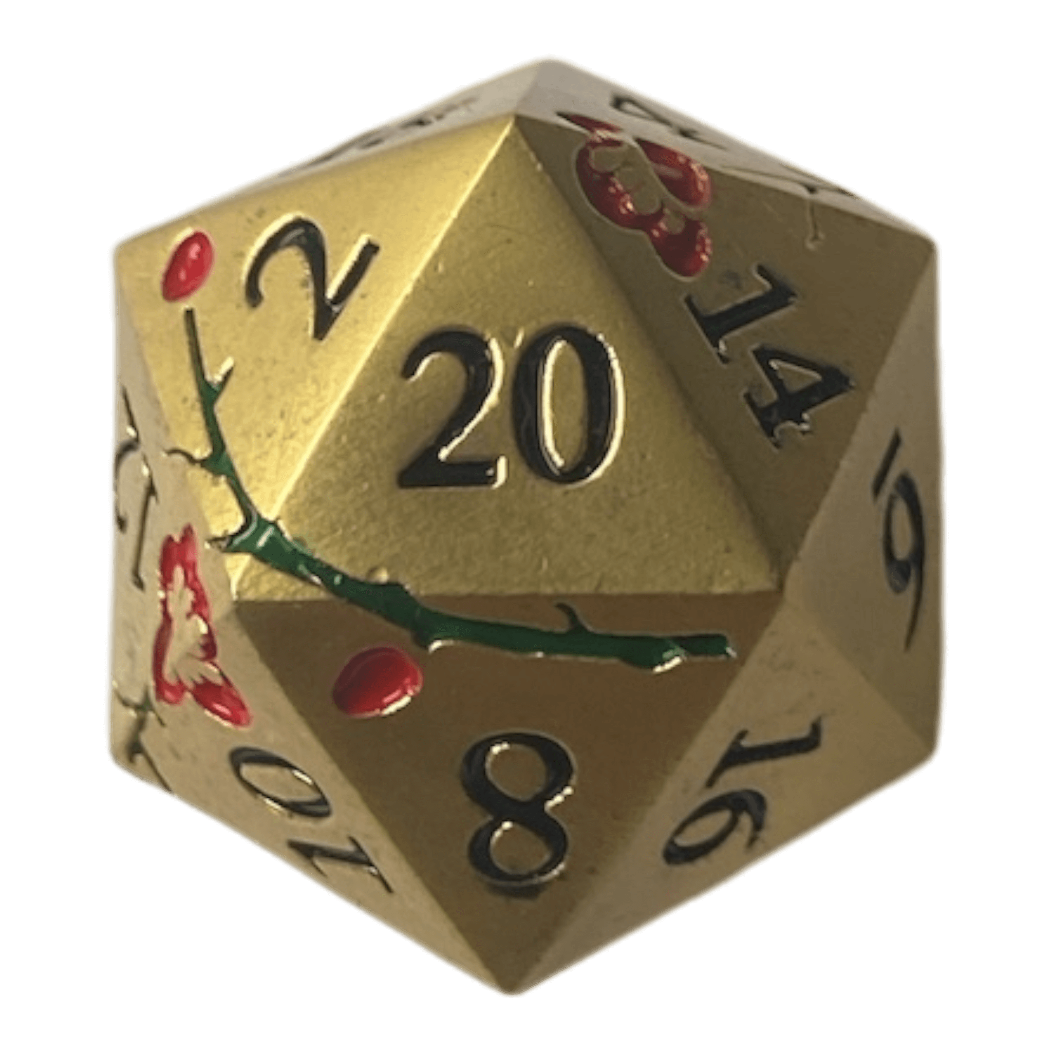 Ideal für Rollenspiele, Tabletop-Games oder als besonderes Sammlerstück – der W20 Blumen Metallwürfel in Gold bringt stilvolle Eleganz und herausragende Qualität auf deinen Spieltisch.
