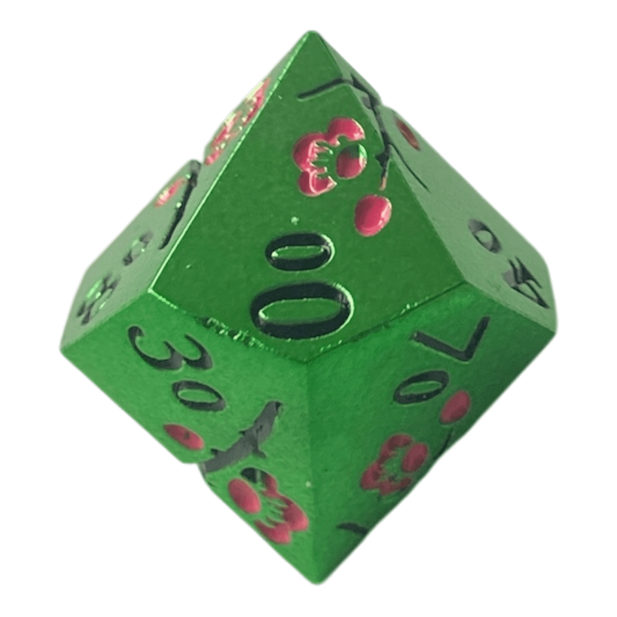 Ideal für Rollenspiele, Tabletop-Games oder als Sammlerstück – der W10-0 Blumen Metallwürfel in Grün verbindet Eleganz und Zuverlässigkeit auf jedem Spieltisch.