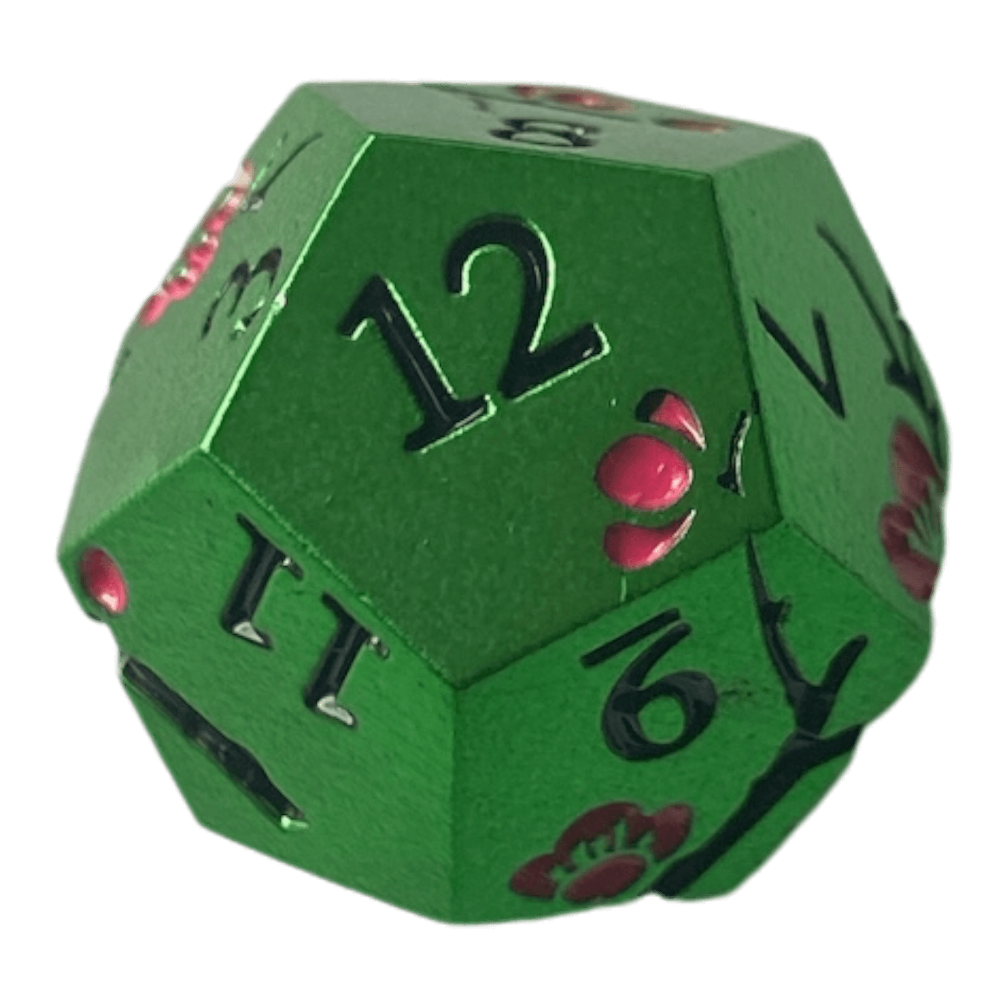 Perfekt für Rollenspiele, Tabletop-Games oder als exklusives Sammlerstück – der W12 Blumen Metallwürfel in Grün vereint Eleganz und Präzision für jedes Abenteuer.