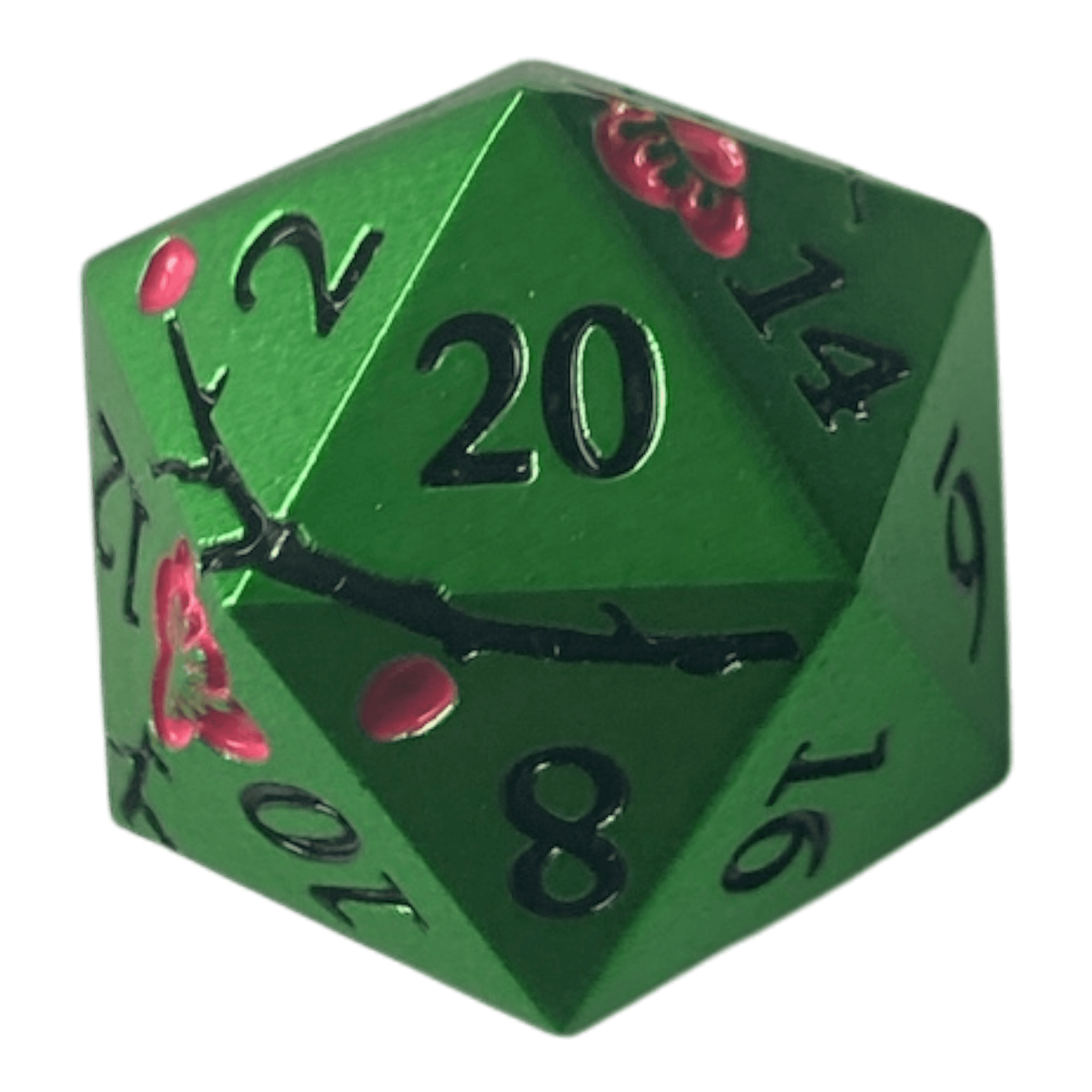 Der W20 Magnolia Metallwürfel in Grün kombiniert eine leuchtend grüne Oberfläche mit einer kunstvoll gestalteten pinken Magnolienblüte, die sich über den gesamten Würfel erstreckt. Die schwarzen Nummern bieten einen eleganten Kontrast und sorgen für eine klare Lesbarkeit. Mit seiner robusten Metallverarbeitung bietet dieser Metallwürfel sowohl eine langlebige Stabilität als auch präzise Würfelergebnisse, die jedes Spiel aufwerten.
