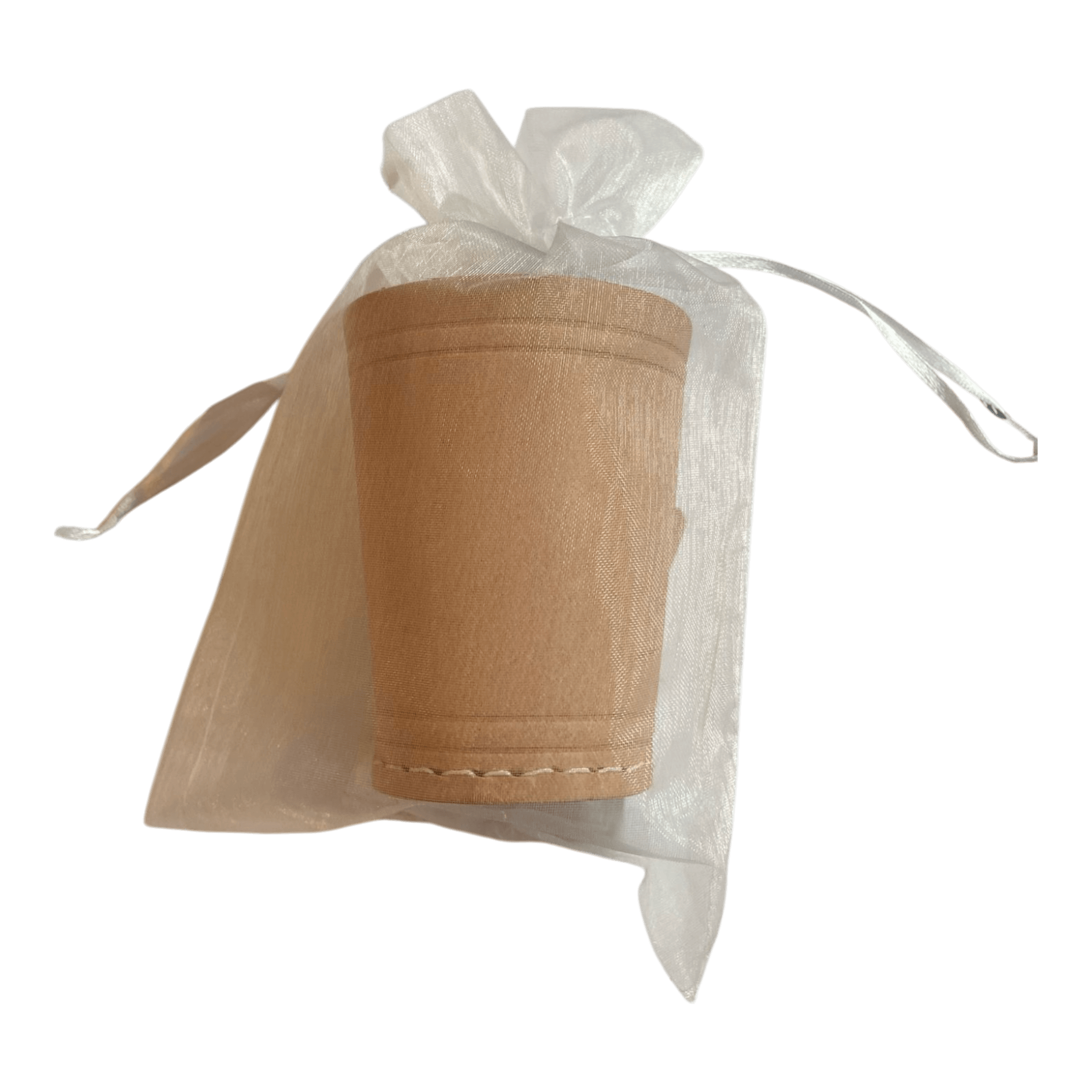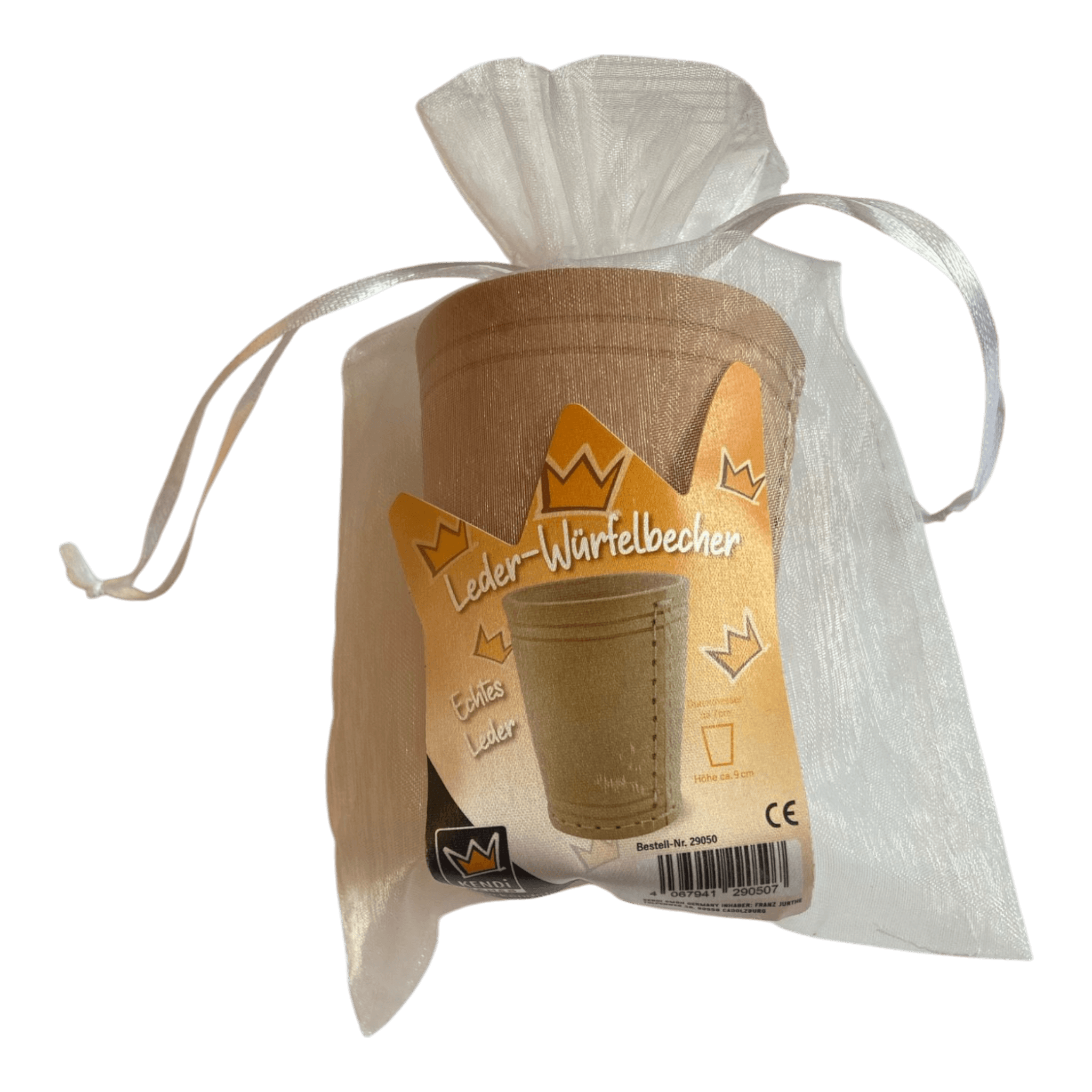 Verpackt ist der Würfelbecher in einem transparenten Stoffsäckchen, das nicht nur schützt, sondern auch optisch überzeugt. Abgerundet wird die Verpackung durch einen Aufkleber aus Textil, der dem Gesamtbild eine stilvolle und natürliche Note verleiht.