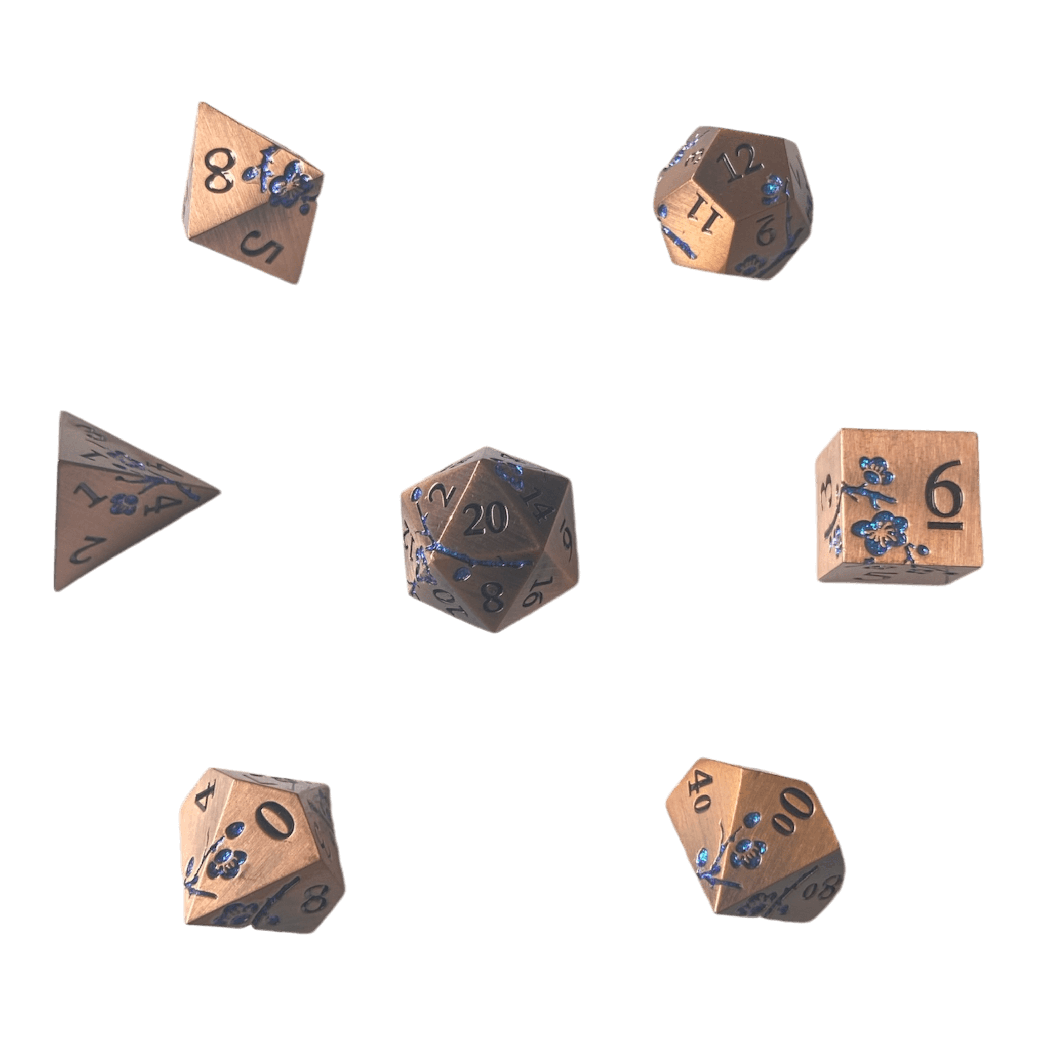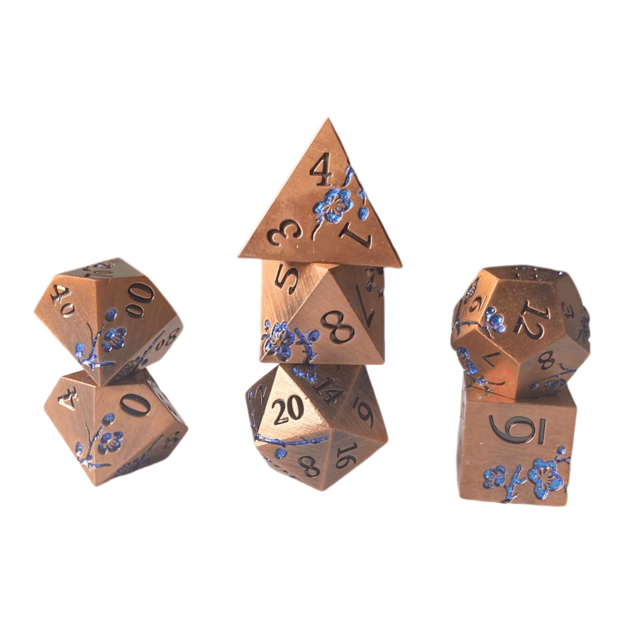 Das Magnolia Würfelset in Kupfer vereint klassische Eleganz mit einem modernen, floralen Design. Über die glänzende kupferfarbene Oberfläche der Metallwürfel ziehen sich kunstvoll gestaltete, glitzernde blaue Blumen, die dem Würfel eine faszinierende optische Tiefe verleihen. Diese farblichen Akzente harmonieren perfekt mit der robusten Metallverarbeitung, die für langlebige Stabilität und präzise Würfelergebnisse sorgt.