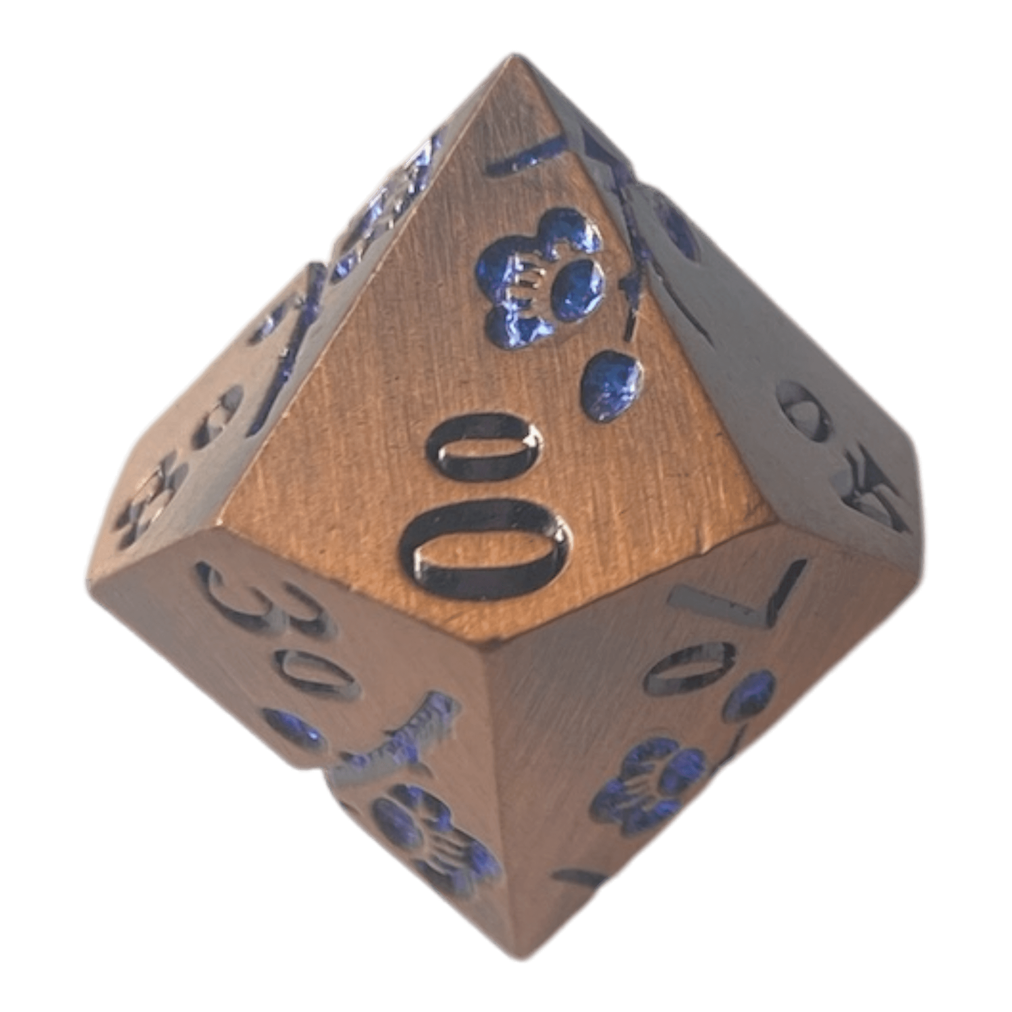 Perfekt für Rollenspiele, Tabletop-Games oder als exklusives Sammlerstück – der W10-0 Blumen Metallwürfel in Kupfer bringt Ästhetik und Verlässlichkeit auf deinen Spieltisch.