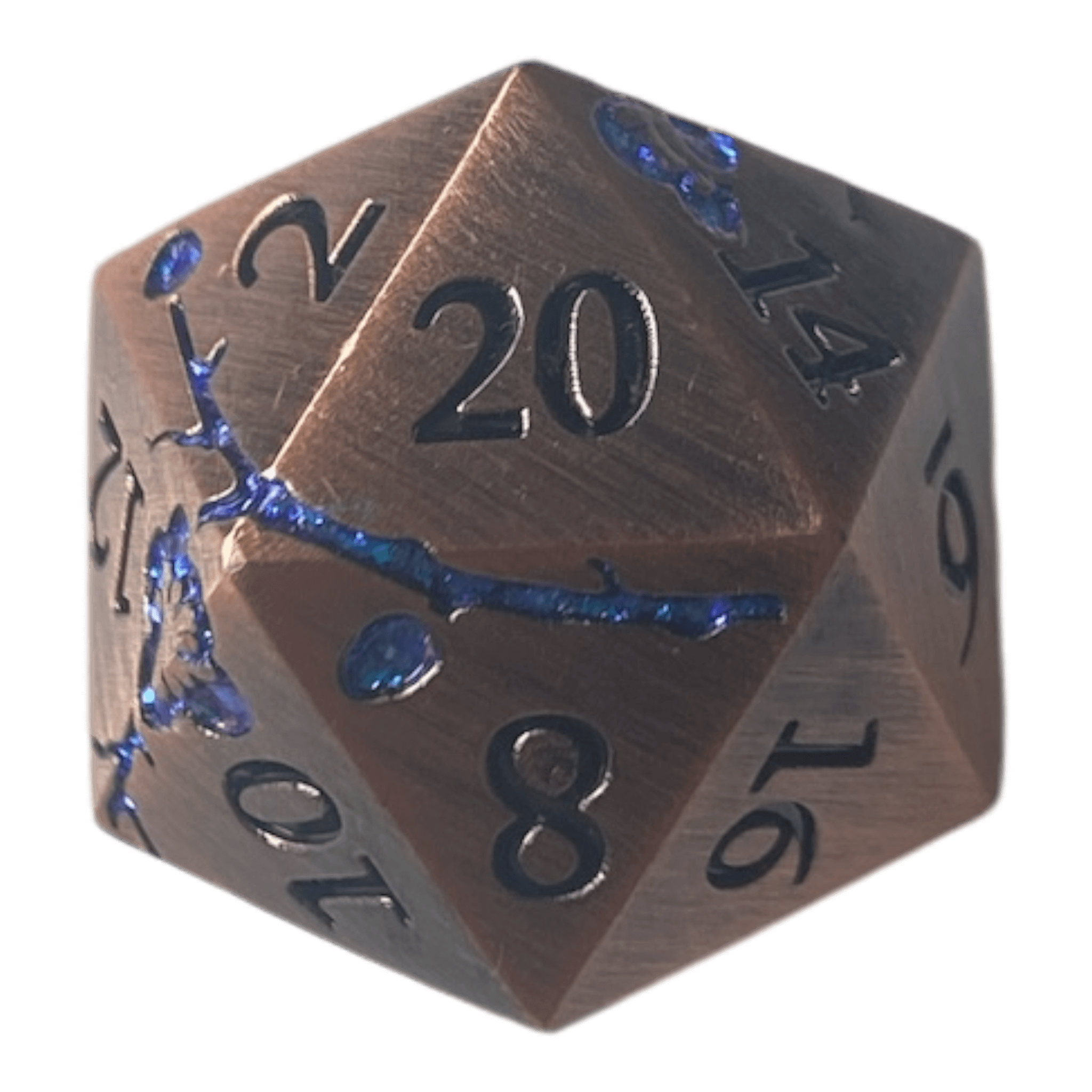 Der W20 Magnolia Metallwürfel in Kupfer vereint edles Design mit langlebiger Funktionalität. Die glitzernden blauen Blumen, die sich kunstvoll über die kupferfarbene Oberfläche ziehen, verleihen dem Würfel eine besondere optische Tiefe und Eleganz. Die robusten Materialien garantieren nicht nur eine beeindruckende Ästhetik, sondern auch präzise und verlässliche Würfelergebnisse bei jedem Wurf.