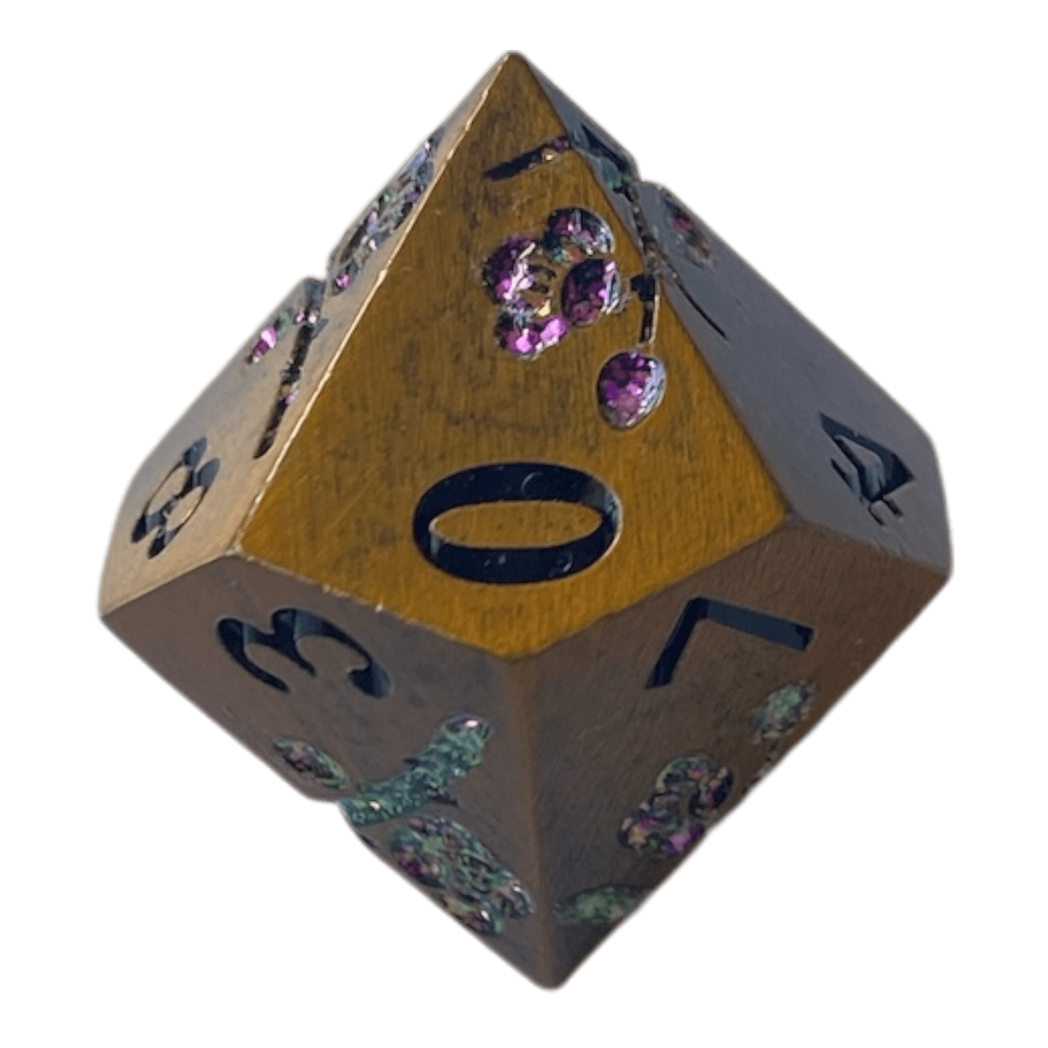 Perfekt für Rollenspiele, Tabletop-Games oder als exklusives Sammlerstück – der W10 Blumen Metallwürfel in Kupfer bringt Eleganz und Präzision auf deinen Spieltisch.