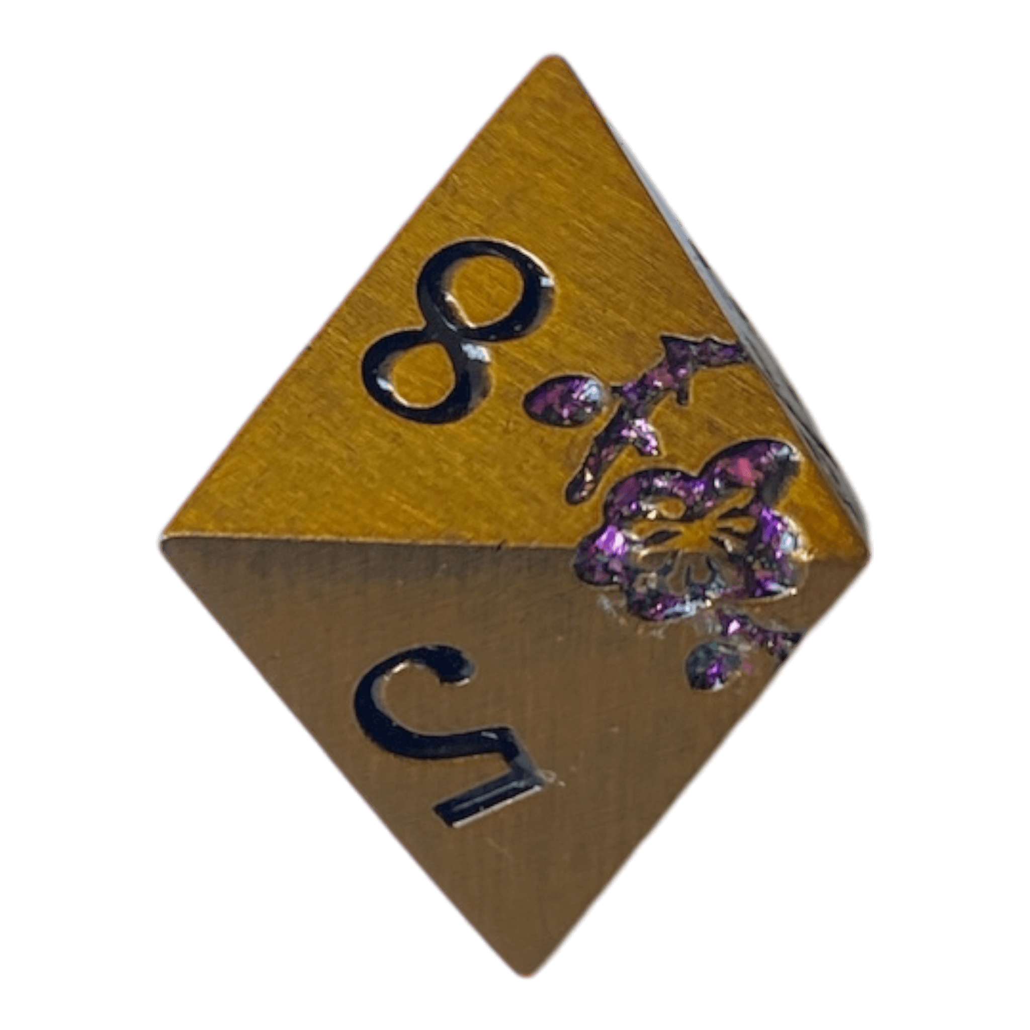 Ideal für Rollenspiele, Tabletop-Games oder als Sammlerstück – der W8 Blumen Metallwürfel in Kupfer kombiniert Eleganz und Präzision auf deinem Spieltisch.