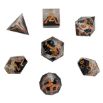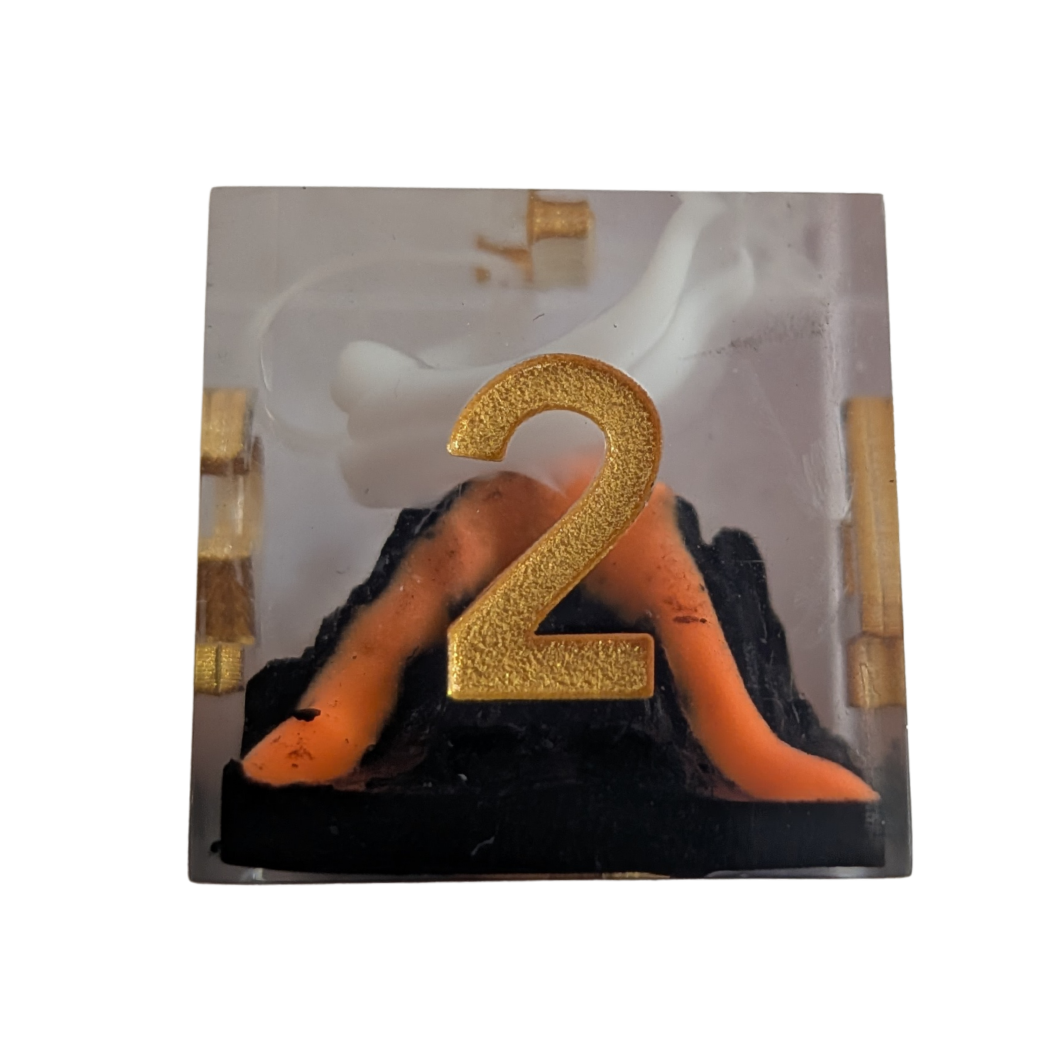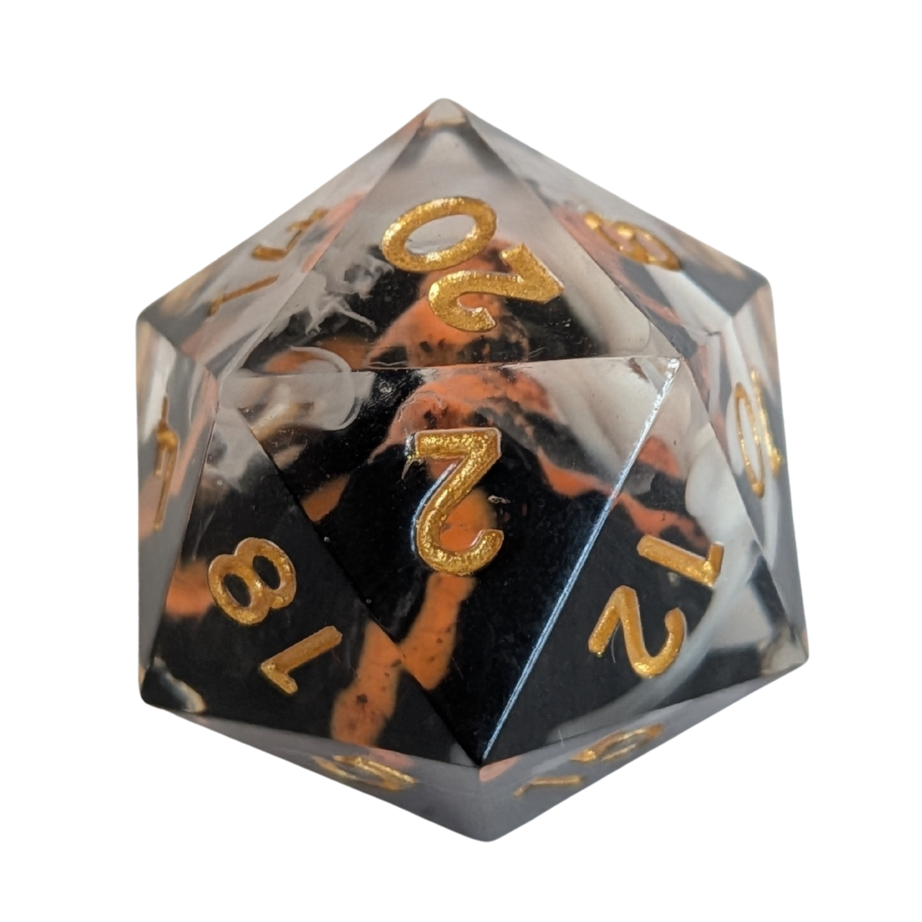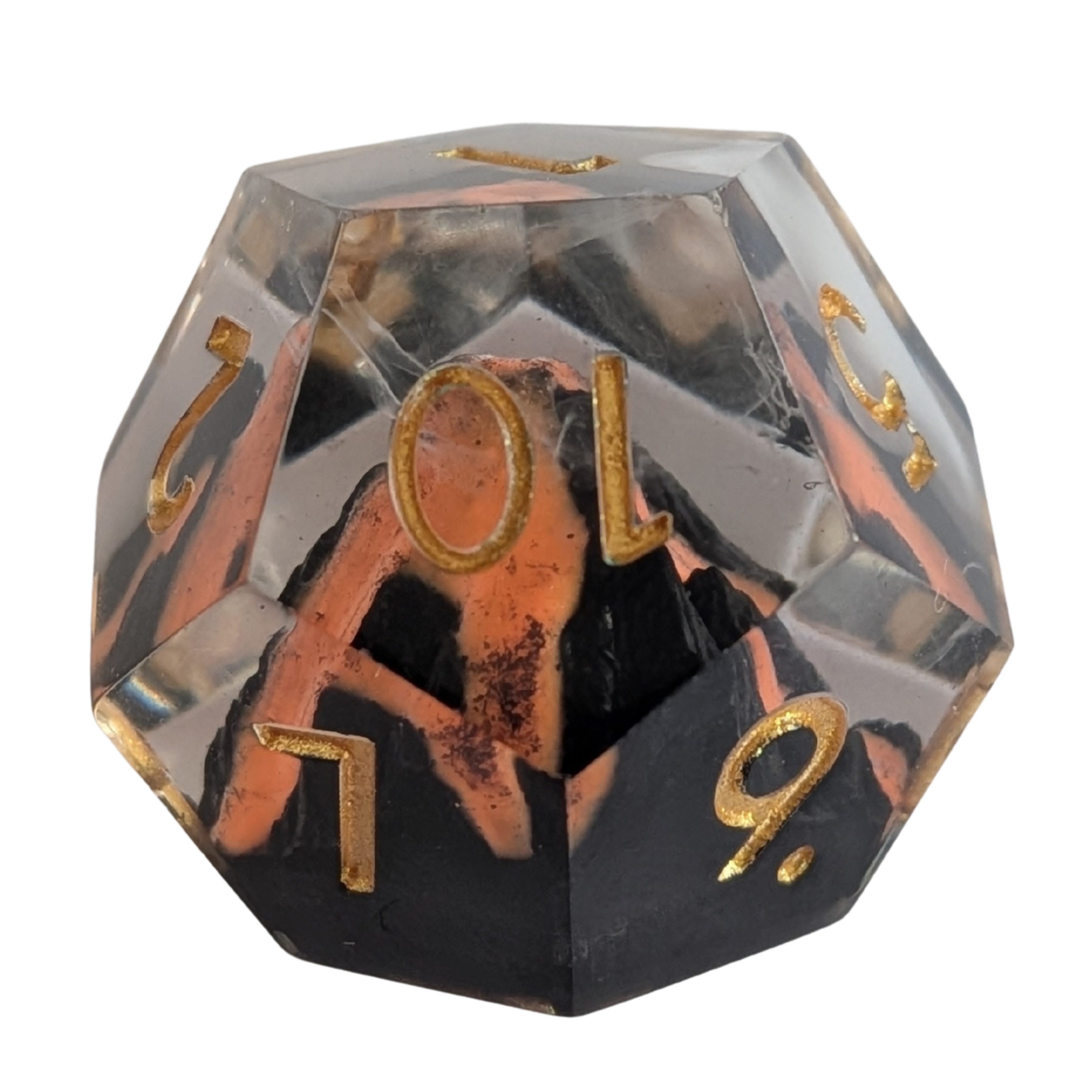 Dieses eindrucksvolle Würfelset fängt die rohe Kraft eines Vulkans ein. Die transparenten (clear) Würfel kombinieren tiefes schwarz mit leuchtendem orange, wodurch der Eindruck glühender Lava entsteht, die sich unter der Oberfläche bewegt.
