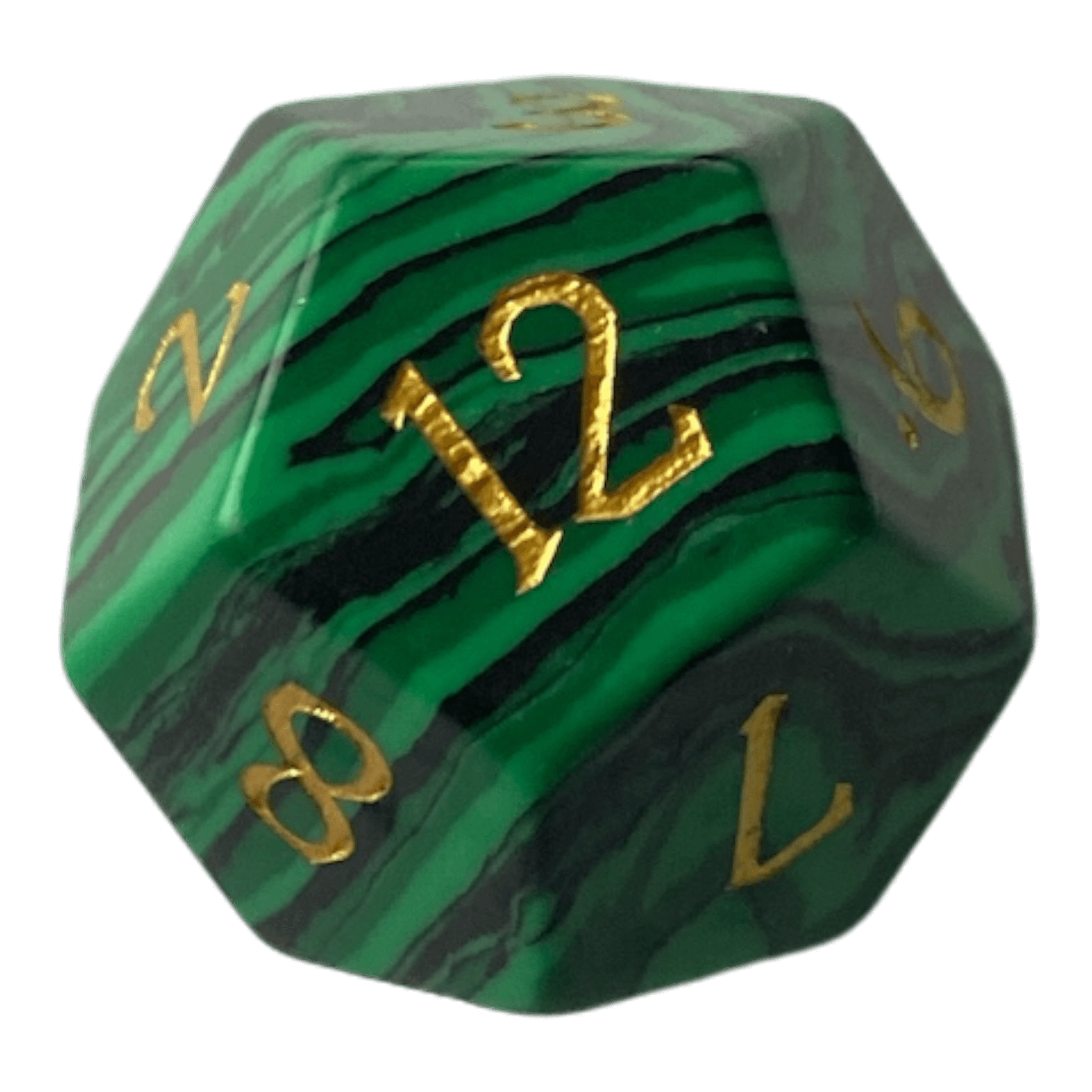Ideal für Rollenspiele, Tabletop-Games oder als exklusives Sammlerstück – der W12 Malachit Würfel in Grün/Schwarz bringt Eleganz und Präzision in jedes Spiel.