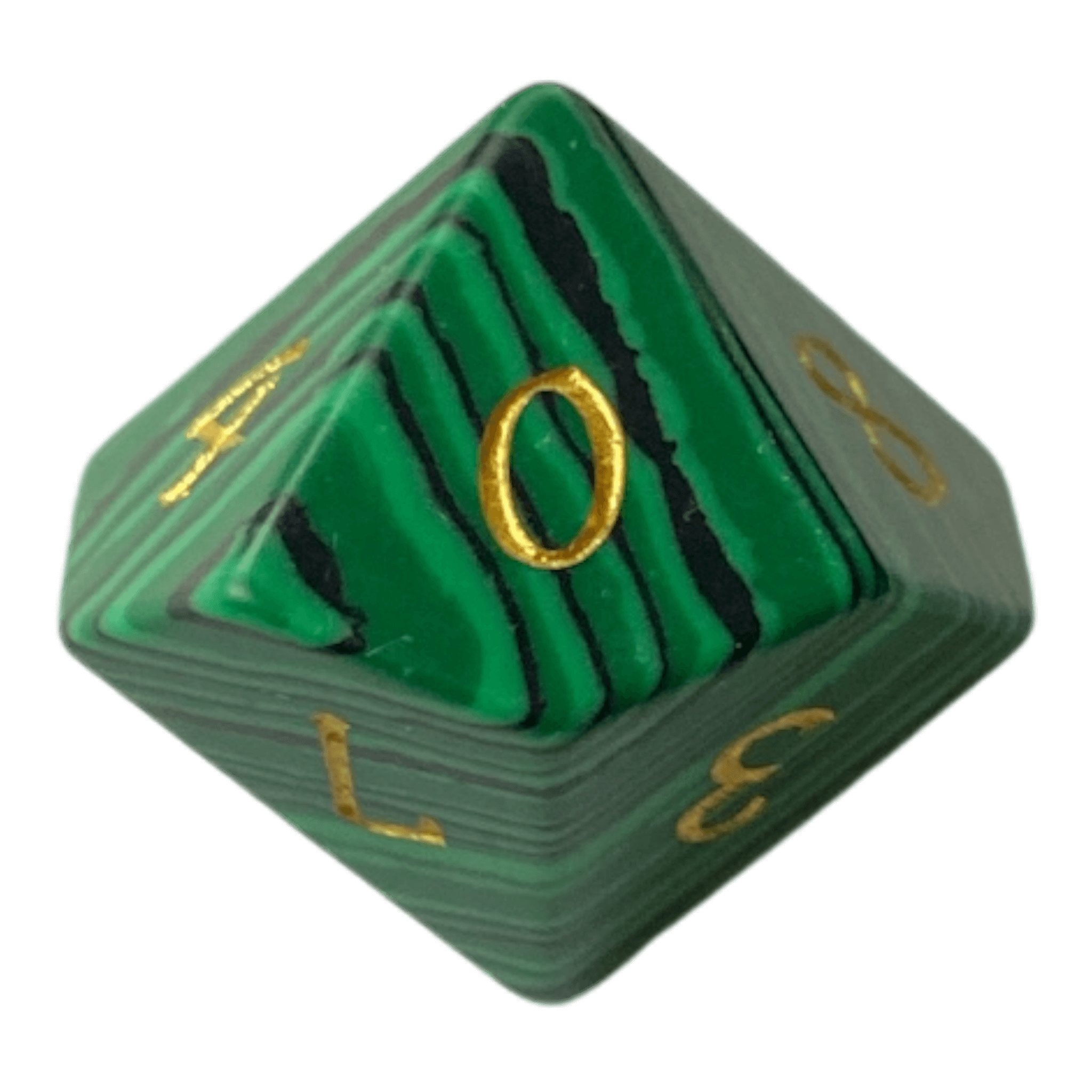 W10 Malachit Edelsteinwürfel in Grün/Schwarz – Handgefertigte Steinverarbeitung mit goldenen Nummern