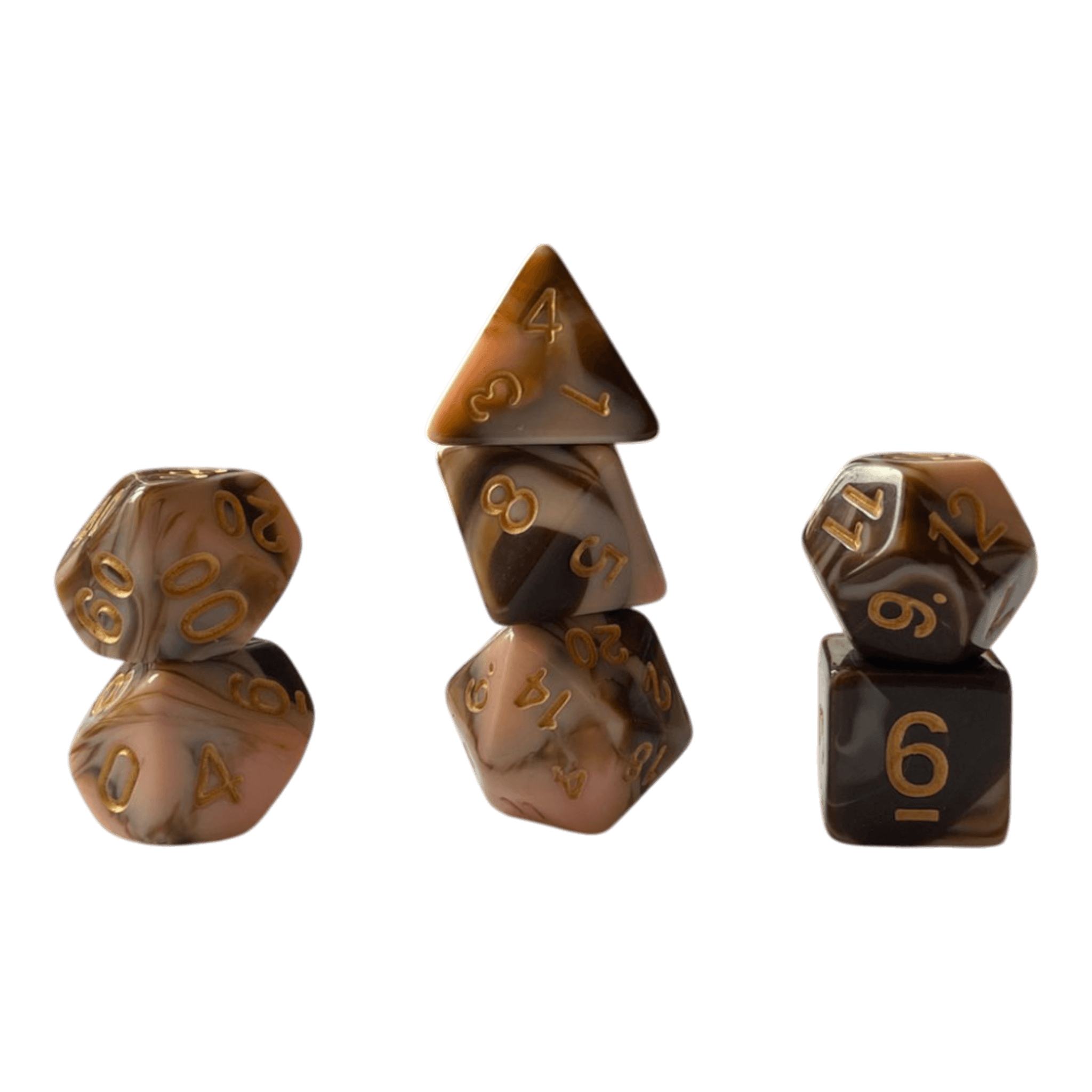 Das Chocolate & Rosa Marmorierte Würfel-Set aus hochwertigem Kunststoff verbindet außergewöhnliche Ästhetik mit präziser Funktionalität. Die harmonische Marmorierung aus warmen Schokoladen- und zarten Rosatönen macht die Würfel zu einem einzigartigen Hingucker. Die goldenen Zahlen heben sich klar und stilvoll vom marmorierten Hintergrund ab und sorgen für eine mühelose Ablesbarkeit während des Spiels.
