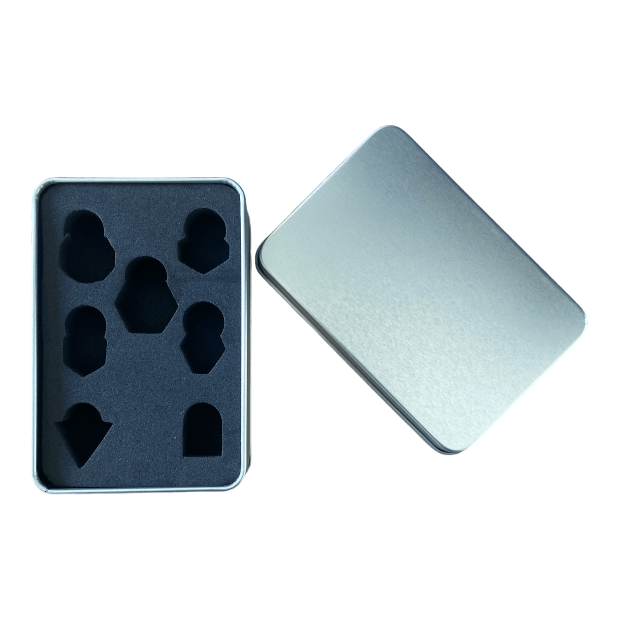 Das passgenaue Inlay im Inneren dieser Würfelbox hält bis zu 7 Würfel sicher und geordnet an ihrem Platz. Ideal als Zubehör für Brettspiele, Rollenspiele oder für Sammler – dieses Metalletui kombiniert Funktionalität mit einem stilvollen Erscheinungsbild und ist ein Muss für jeden Würfel-Fan.