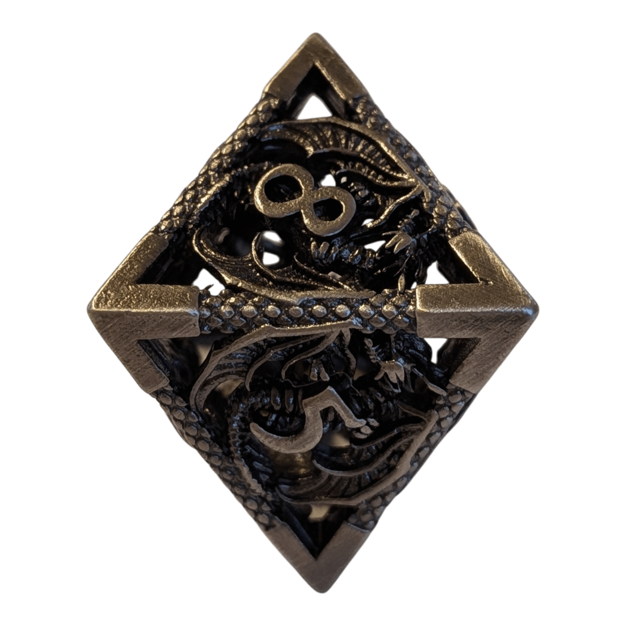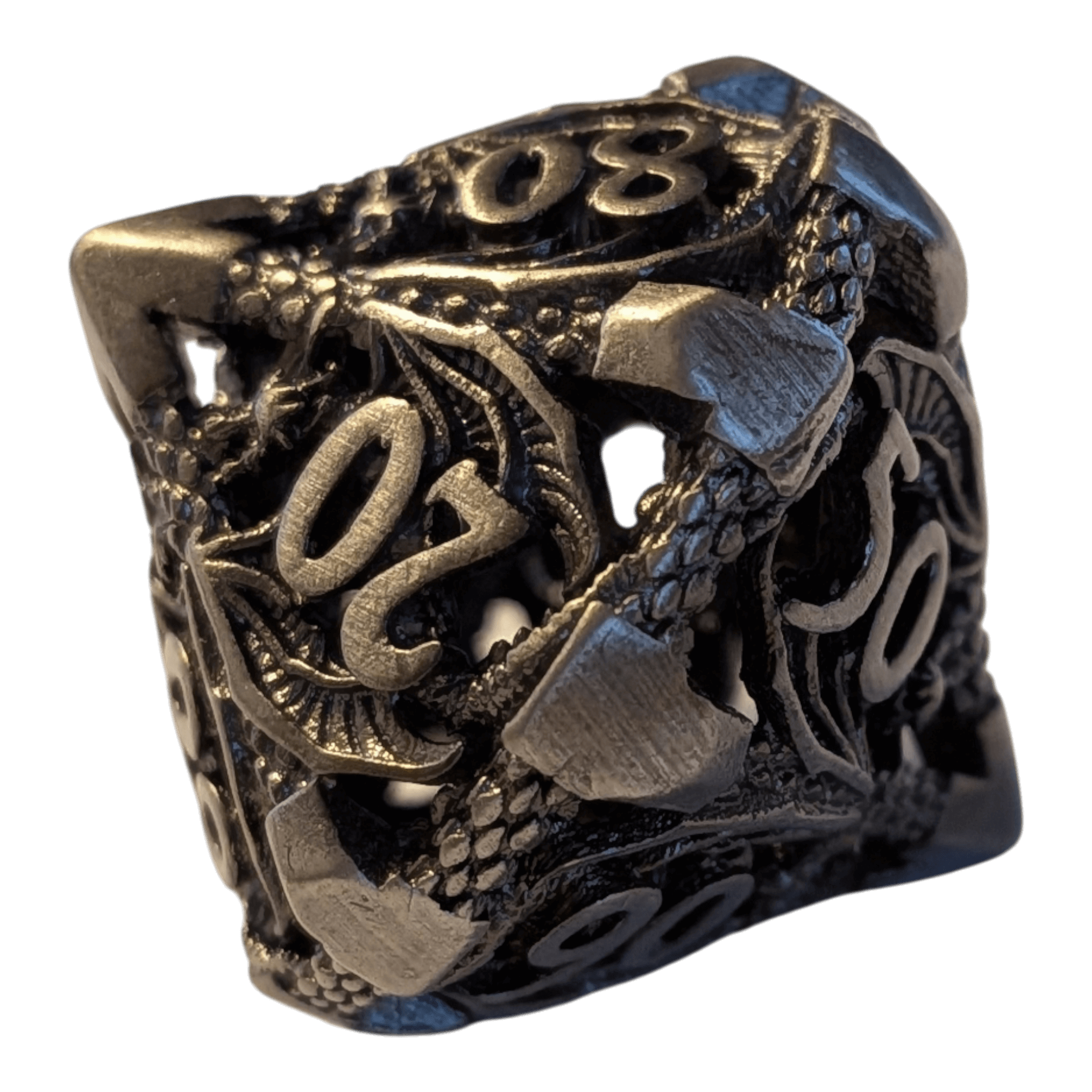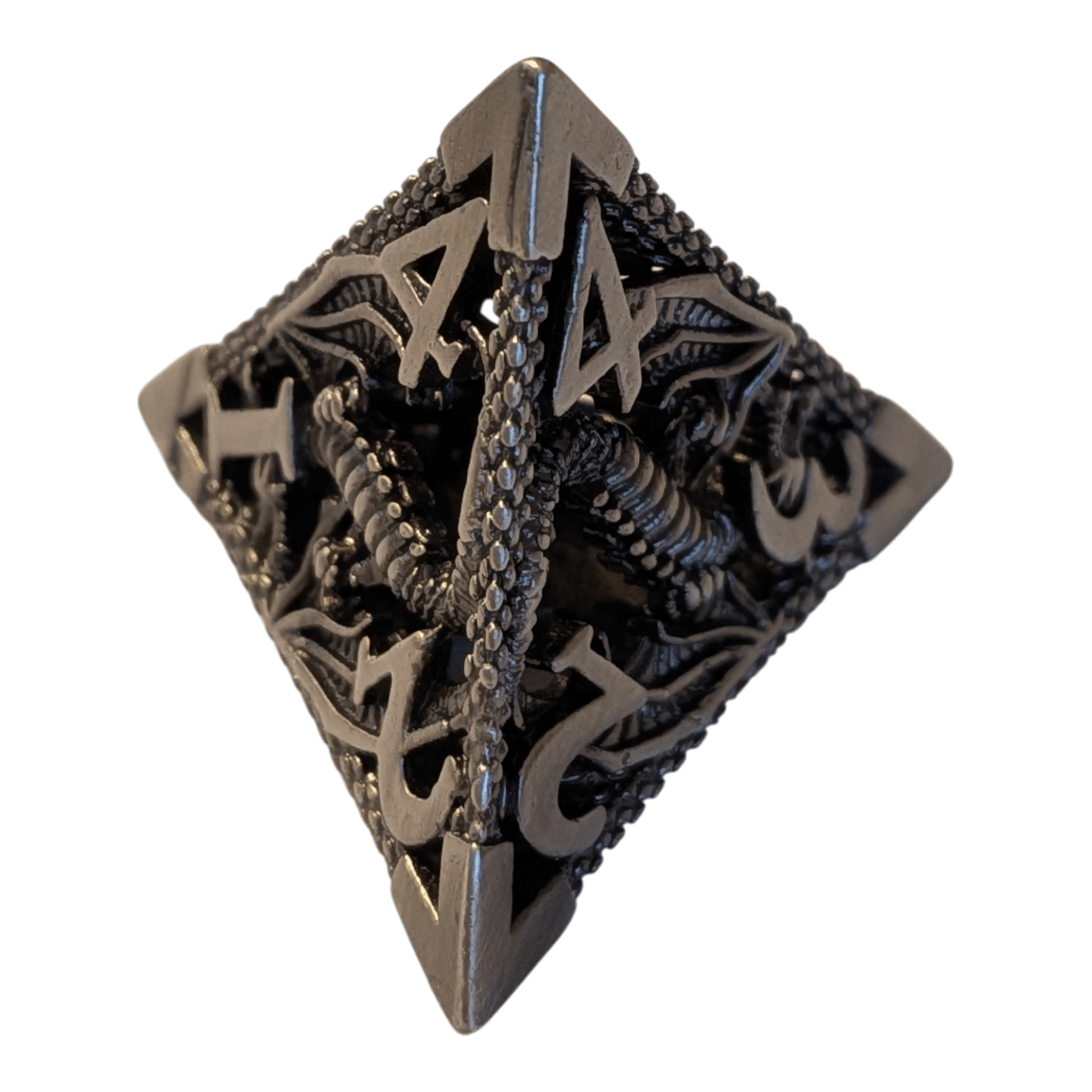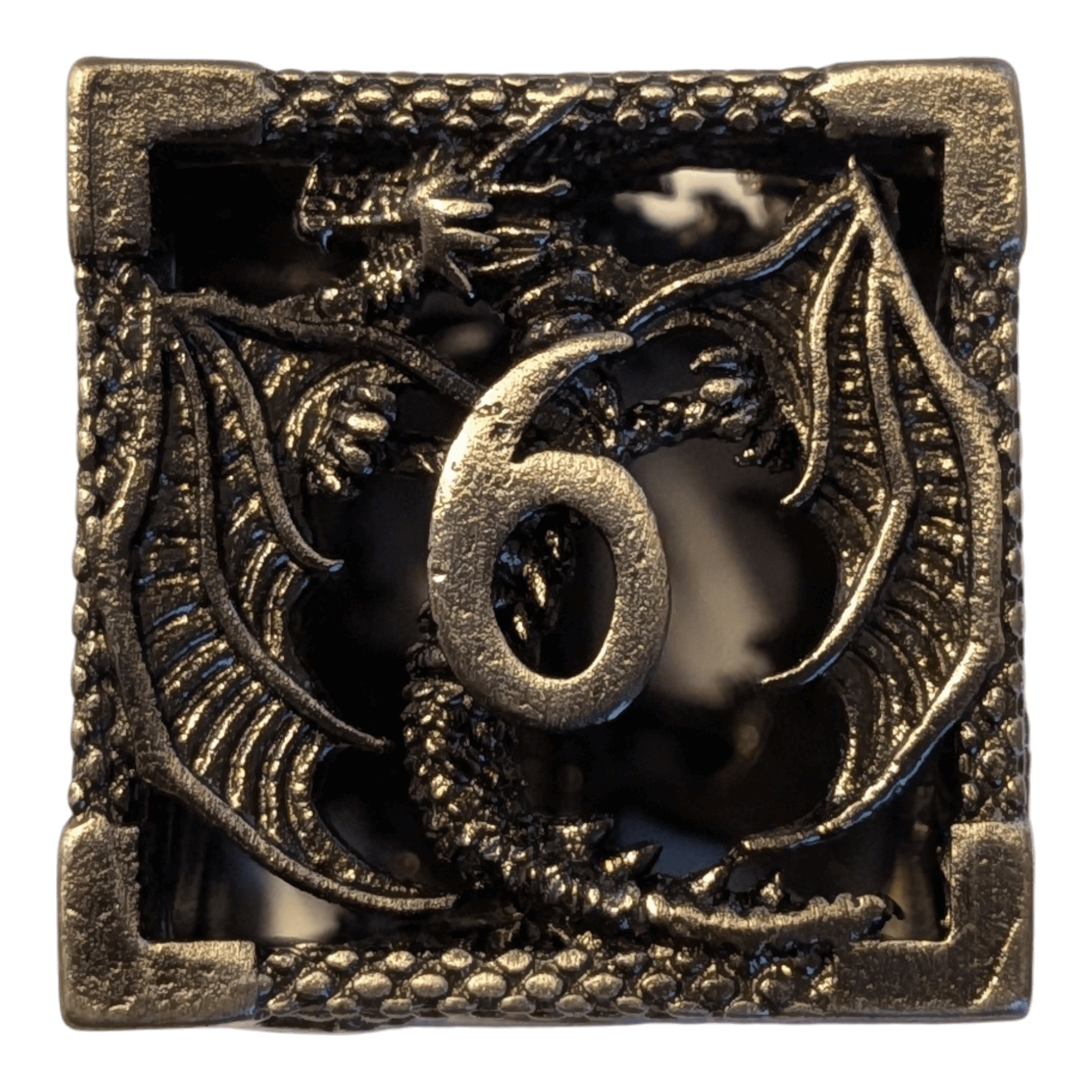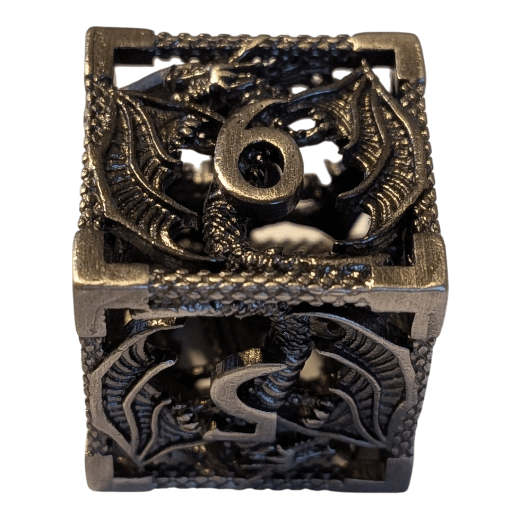 Dieses eindrucksvolle Metallwürfelset in antik Silber verbindet edles Design mit der Macht mythischer Kreaturen. Jeder Würfel ist mit kunstvollen fliegenden Drachen verziert, die den Würfeln eine epische und zugleich elegante Ausstrahlung verleihen. Das Ergebnis ist ein hochwertiges Drachenwürfel, das optisch wie haptisch begeistert.
