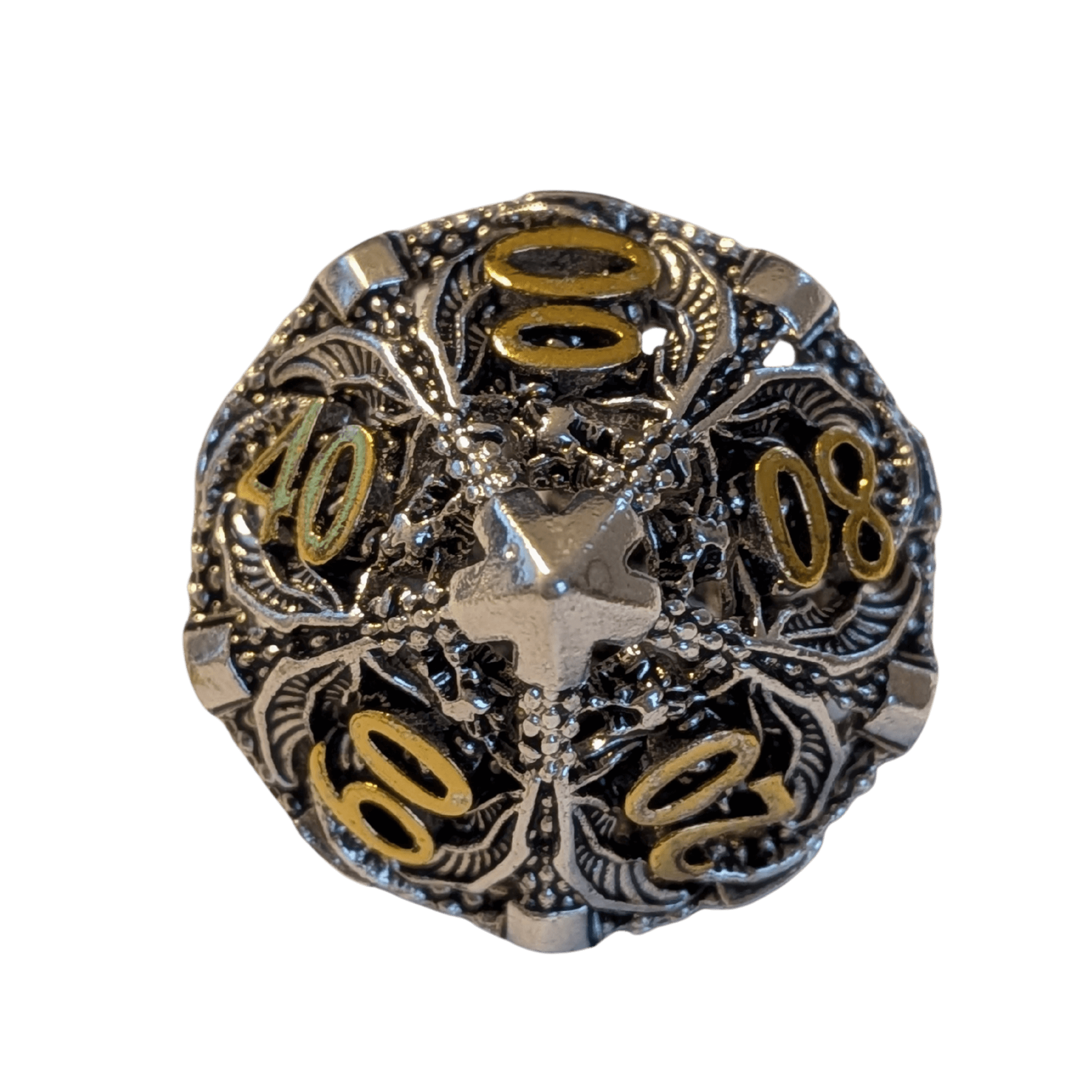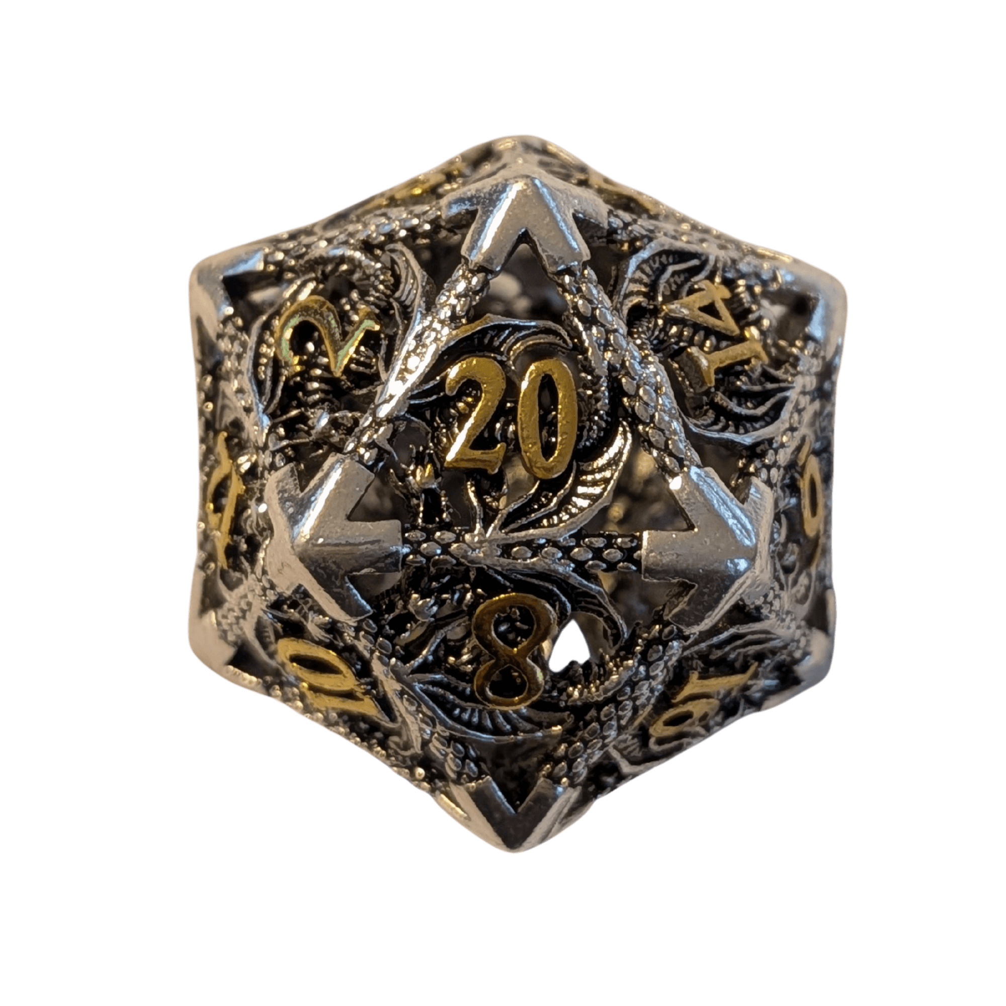 Dieses edle Metallwürfelset in silber und gold vereint hochwertige Verarbeitung mit einem epischen Fantasy-Design. Die massiven Würfel sind detailliert mit fliegenden Drachen verziert, die sich kunstvoll über jede Seite des Sets erstrecken. Der silberne Grundton harmoniert perfekt mit den goldenen Zahlen und Akzenten – ein echter Blickfang auf jedem Spieltisch.