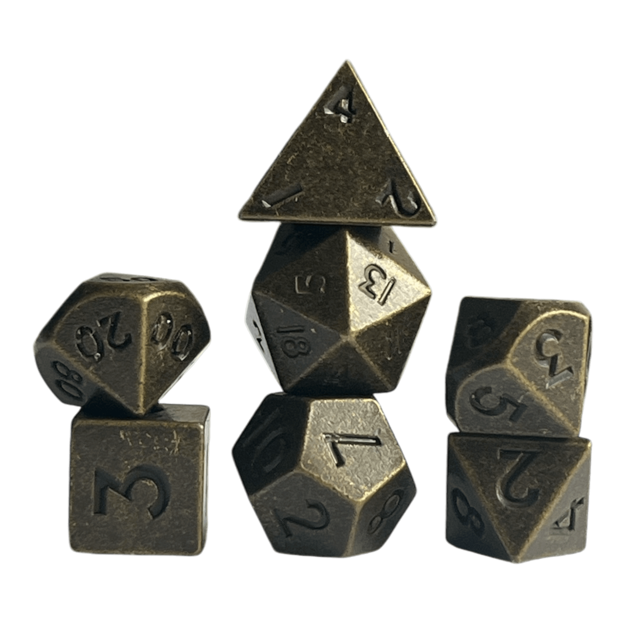 Das Mini 7er Set enthält Metallwürfel in der Seitenanzahl von W4 bis W20. Die Würfel sind zwischen 6 mm und 10 mm groß und aus hochwertigem Messing gefertigt, was ihnen eine robuste und edle Haptik verleiht.