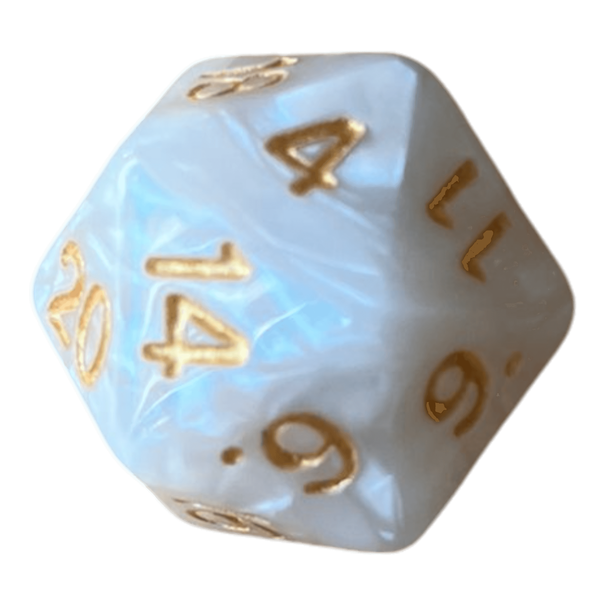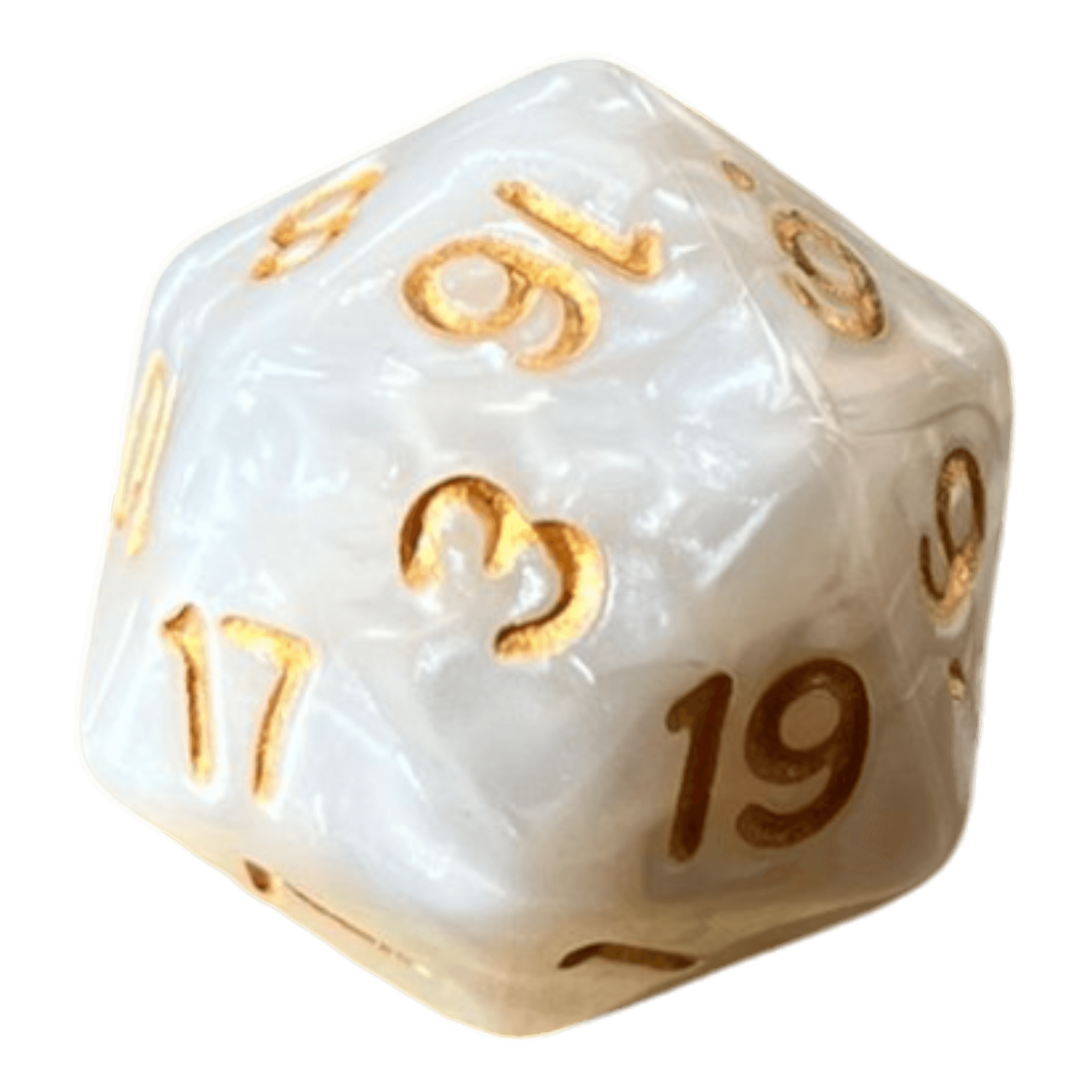 Dieser W20-Würfel aus Kunststoff zeichnet sich durch einen schimmernden Perlmutt-Effekt aus, der je nach Lichteinfall dezente Farbnuancen zeigt. Die Zahlen sind in Gold gehalten und gut lesbar, was die Übersicht beim Spielen erleichtert.