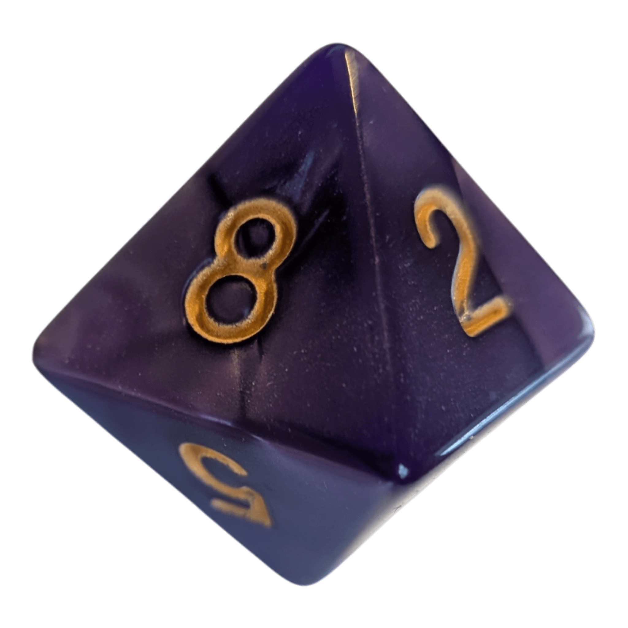 Die goldenen Zahlen bieten einen perfekten Kontrast zum kräftigen Lila und sorgen für klare Lesbarkeit bei jedem Wurf. Gefertigt aus Acrylmaterial, eignet sich der W8 hervorragend für Rollenspiele wie Dungeons & Dragons, Pathfinder oder jedes System, das einen achtseitigen Würfel benötigt.