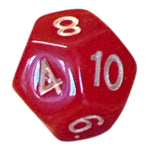 Dieser W12 Würfel besticht durch seine elegante Perlmutt-Optik in leuchtendem Rot und fein gravierte goldene Zahlen, die einen edlen Kontrast bilden. Der leicht schimmernde Effekt sorgt dafür, dass der Würfel je nach Lichteinfall unterschiedliche Nuancen zeigt – ein echter Blickfang auf jedem Spieltisch.
