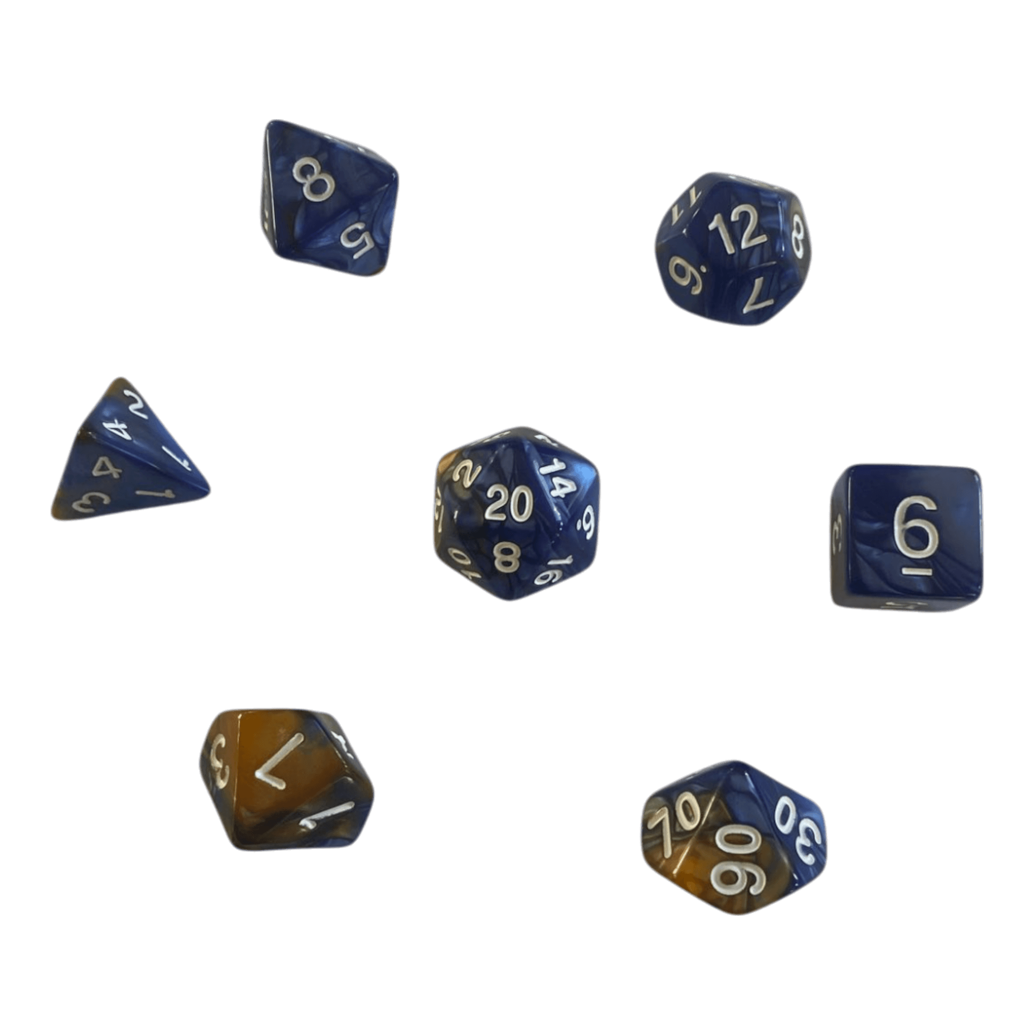 Dieses Perlmutt Würfelset in den edlen Farben Blau und Gold bringt stilvolle Akzente an deinen Spieltisch. Die Perlmutt-Optik sorgt für ein schimmerndes Farbspiel, das je nach Lichteinfall variiert und jedem Würfel eine individuelle Note verleiht. Die weißen Zahlen bilden einen klaren Kontrast zu den dunklen und goldenen Nuancen und ermöglichen eine optimale Lesbarkeit.