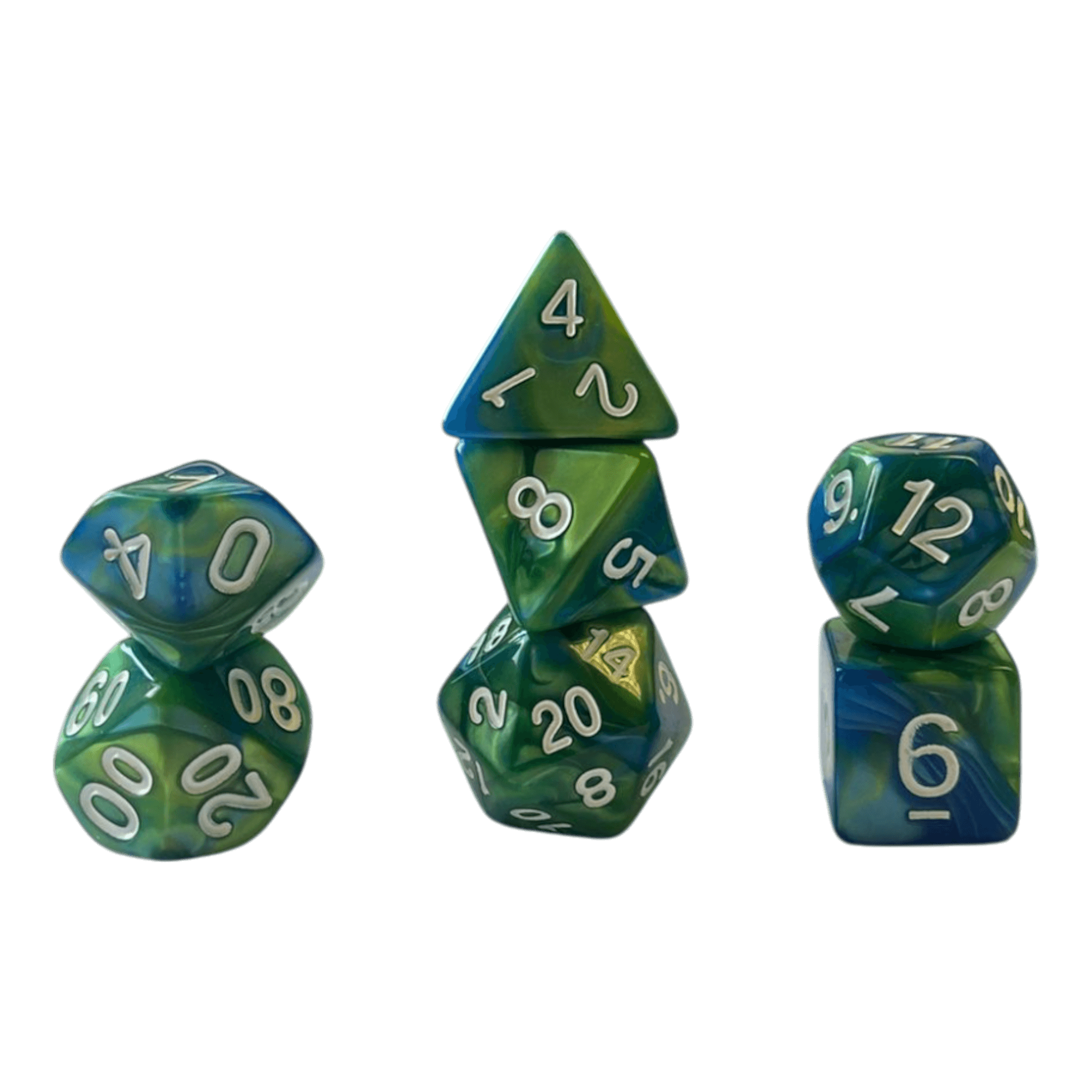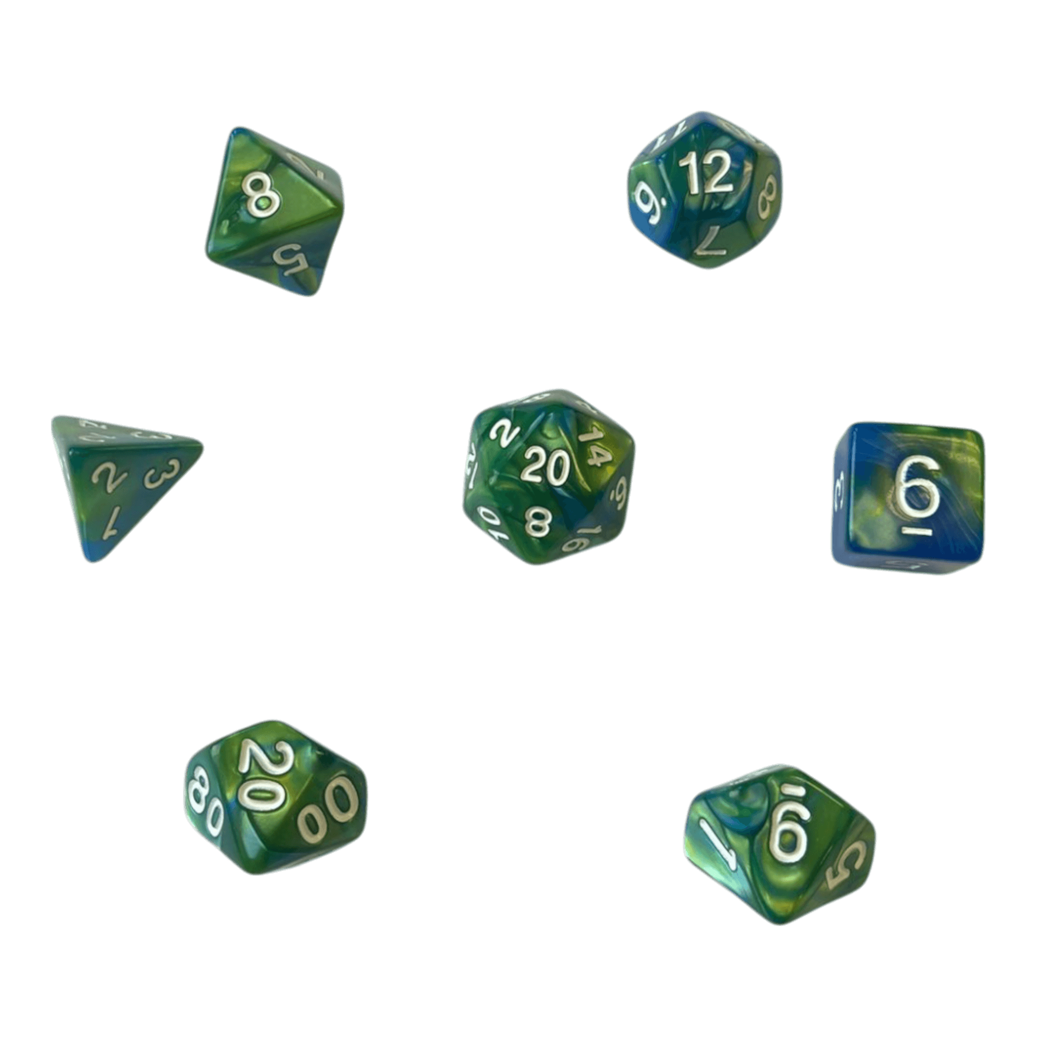 Das Blau & Grün Perlmutt Würfel-Set vereint atemberaubendes Design mit hochwertiger Verarbeitung. Die faszinierenden Farbschattierungen in Blau und Grün, kombiniert mit dem perlmuttschimmernden Effekt, verleihen diesen Würfeln ein einzigartiges Aussehen. Die weißen Zahlen heben sich klar von der Oberfläche ab und garantieren eine einfache Lesbarkeit während des Spiels.