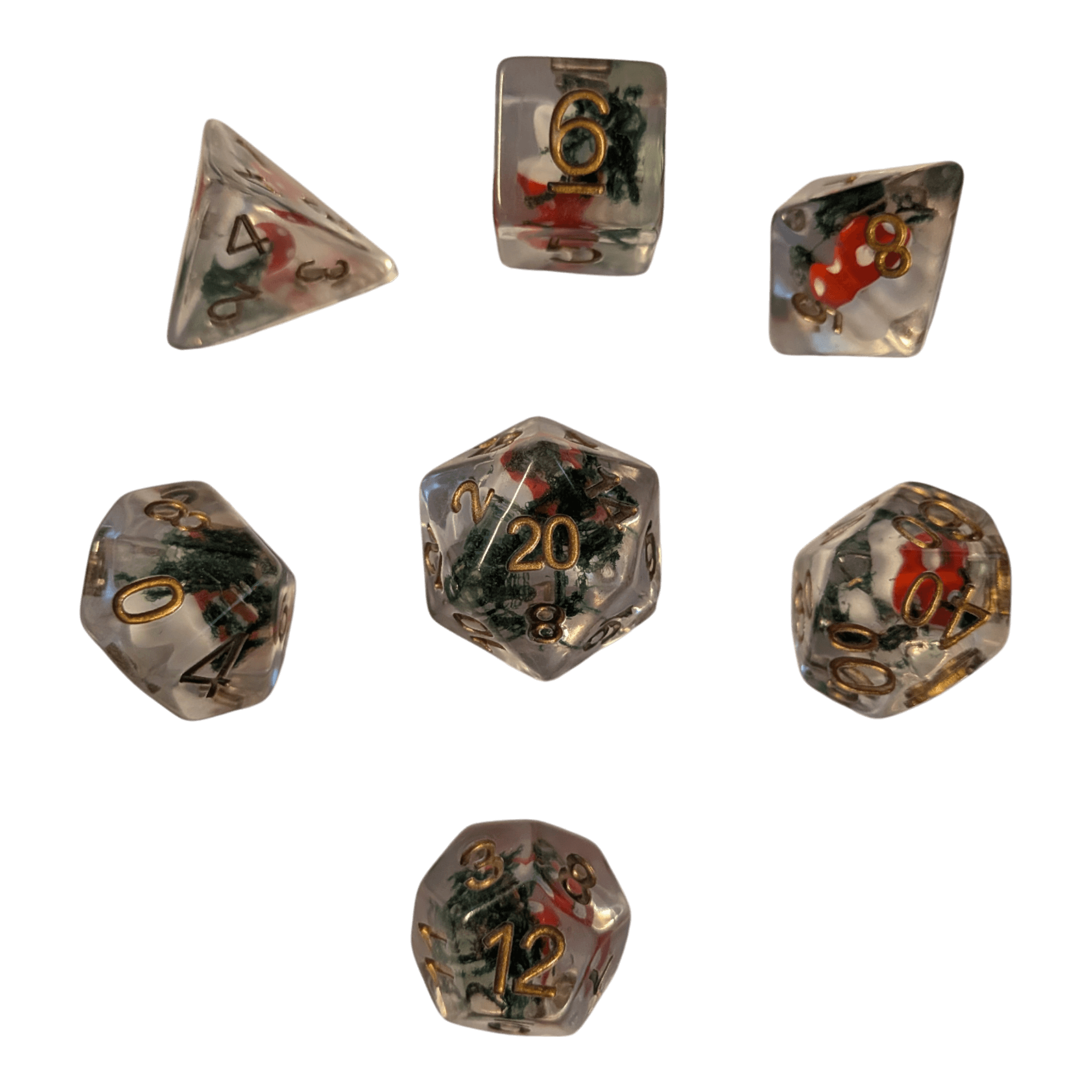 Dieses transparente Würfelset bringt ein Stück Waldmagie direkt auf deinen Spieltisch! Im Inneren jedes Würfels befindet sich ein kleiner Pilz – liebevoll gestaltet und sichtbar durch die klare, transparente Hülle.