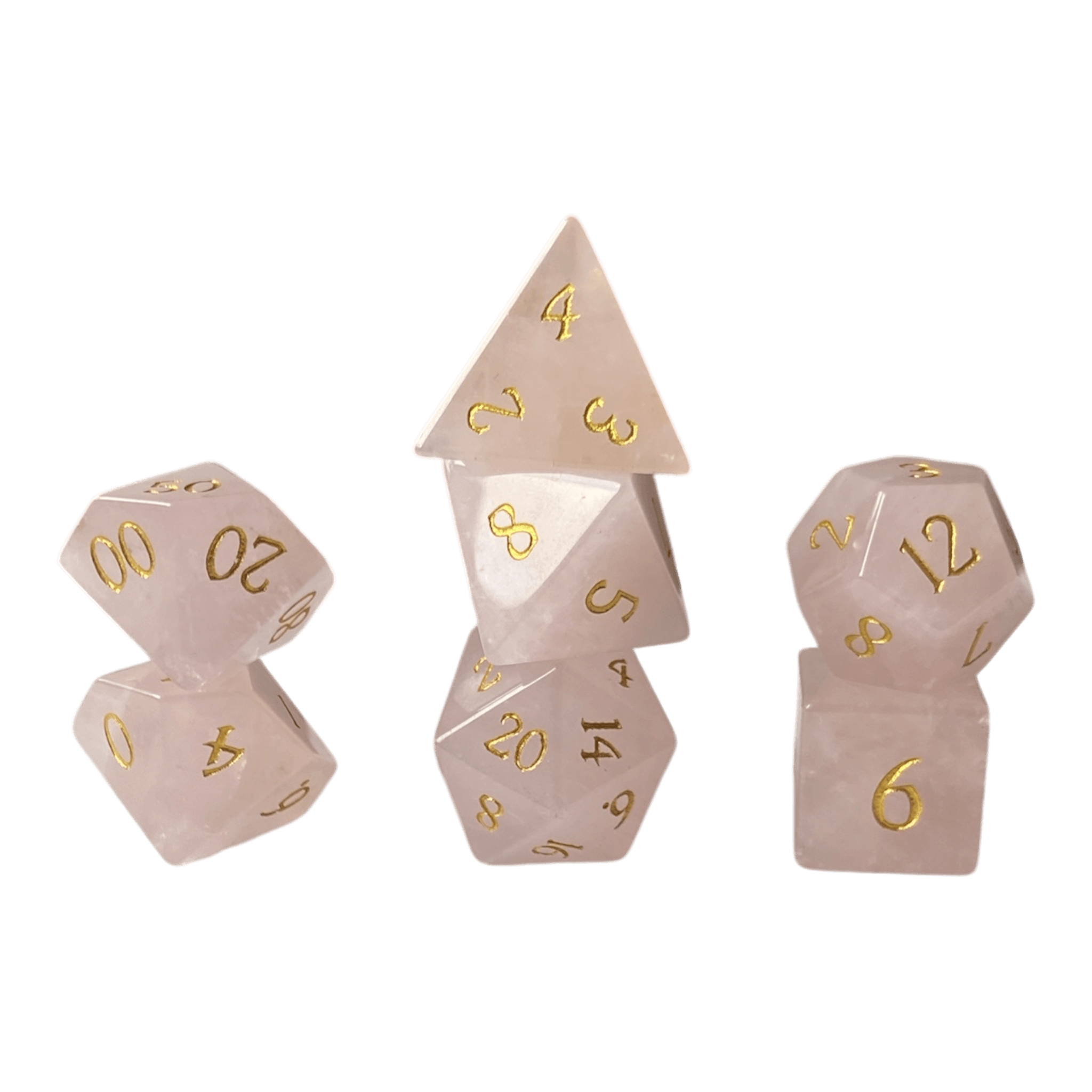 Ideal für Rollenspiele, Tabletop-Games oder als exklusives Sammlerstück – dieses Würfelset bringt die zeitlose Schönheit von Rosenquarz in Kombination mit perfekter Funktionalität auf deinen Spieltisch.