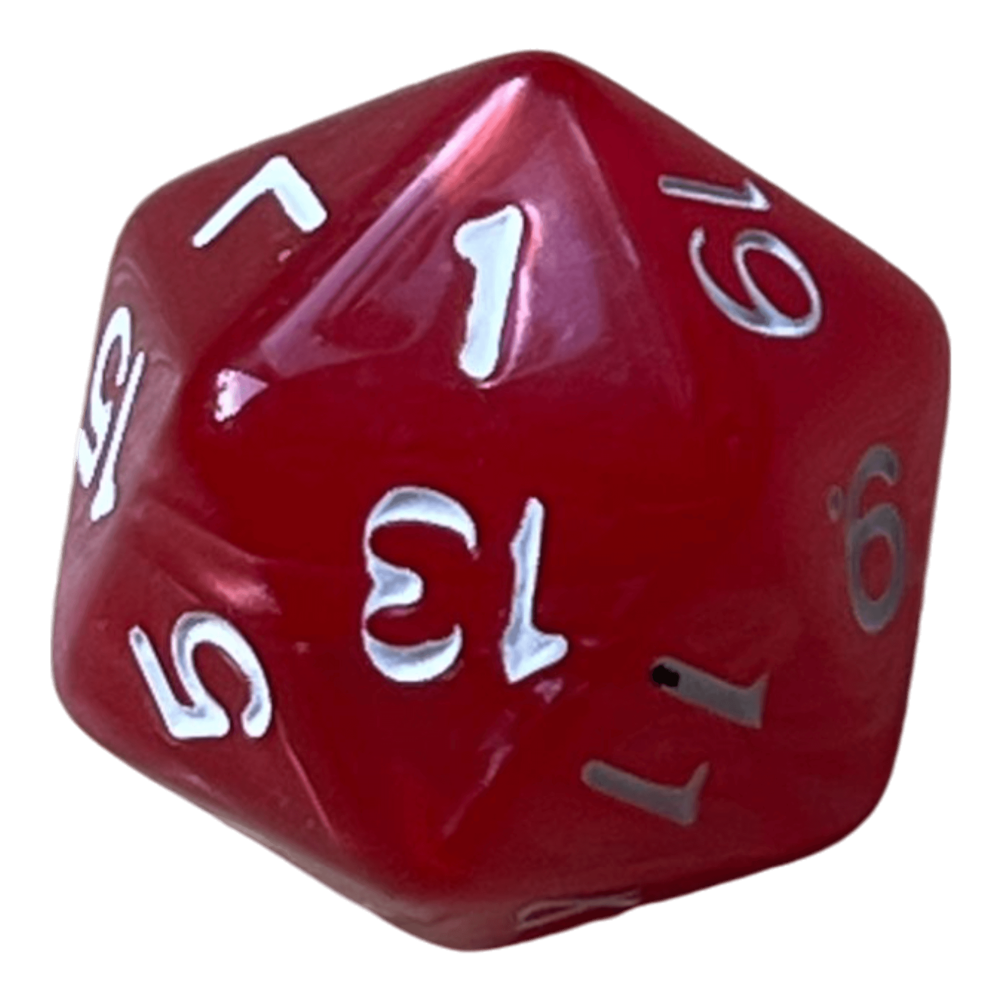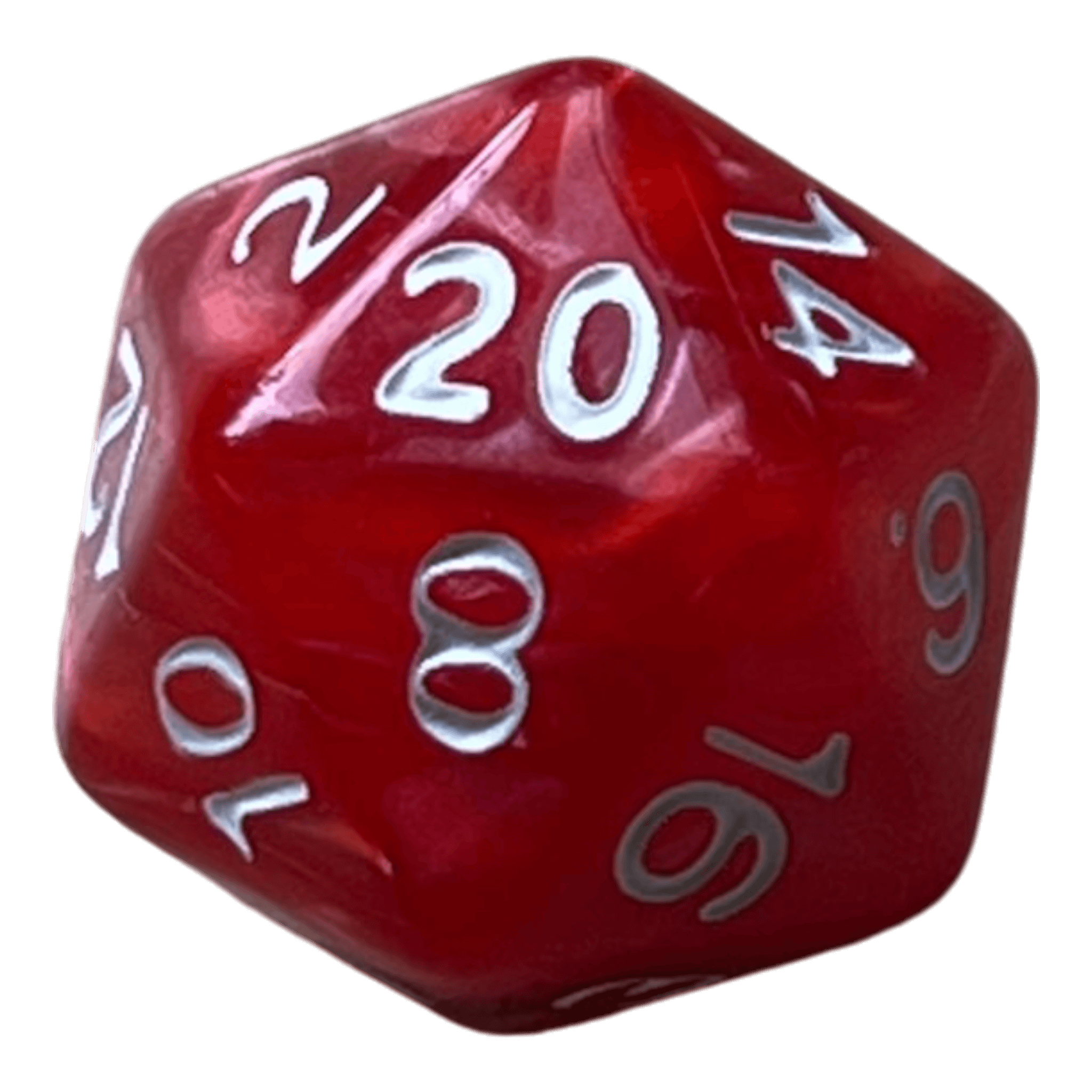 Dieser W20 aus rotem Kunststoff besticht durch seinen eleganten Perlmutt-Effekt, der bei Lichteinfall sanfte Farbverläufe offenbart. Die weißen Zahlen bieten einen deutlichen Kontrast zur roten Oberfläche und sorgen für eine klare Lesbarkeit, auch bei schnellen Würfen während des Spiels.