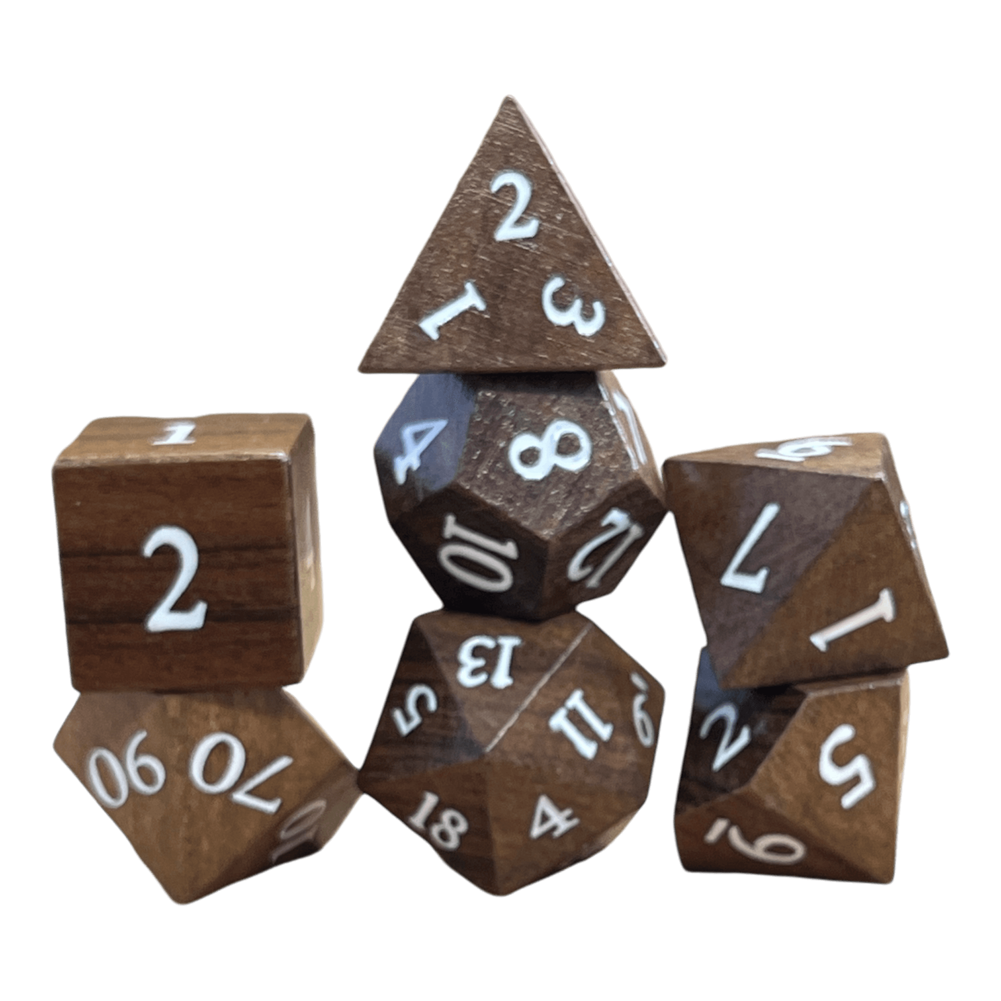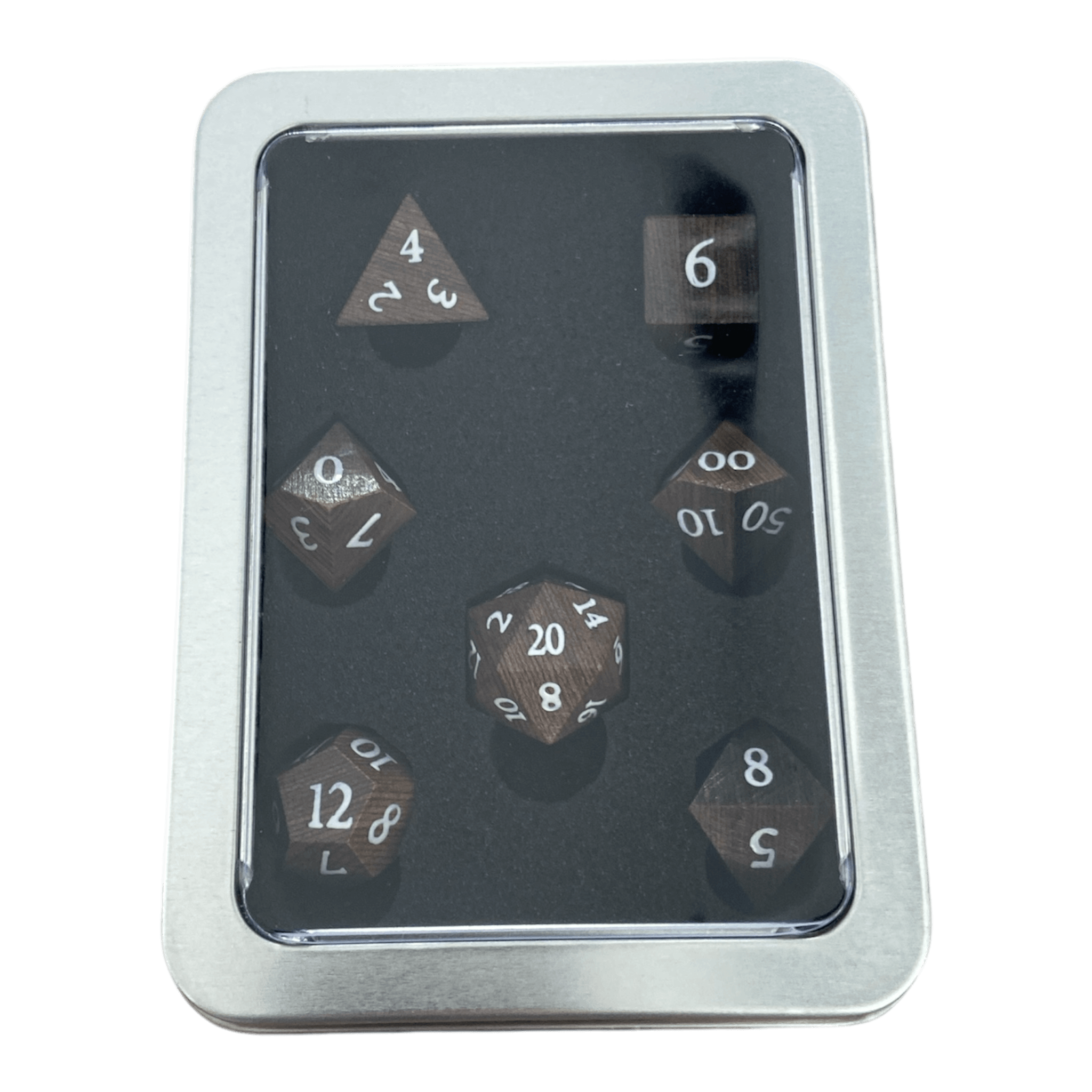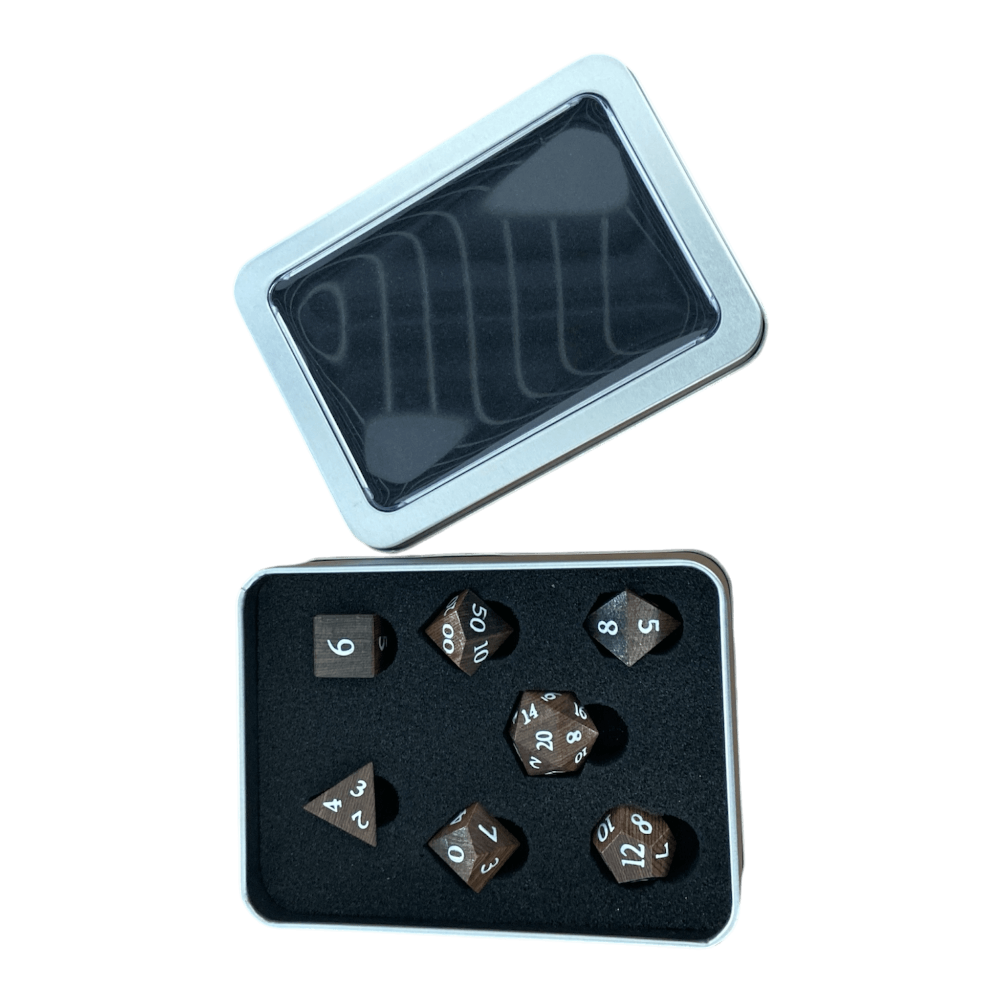 Von W4 bis W20 – alle Würfel sind präzise gefertigt und liegen durch das robuste Holz angenehm schwer in der Hand. Perfekt für lange Spielrunden und ein stilvolles Spielerlebnis. Geliefert wird das Set in einem hochwertigen Metalletui, das nicht nur für sicheren Schutz sorgt, sondern auch einen eleganten Aufbewahrungsort für deine Würfel bietet.
