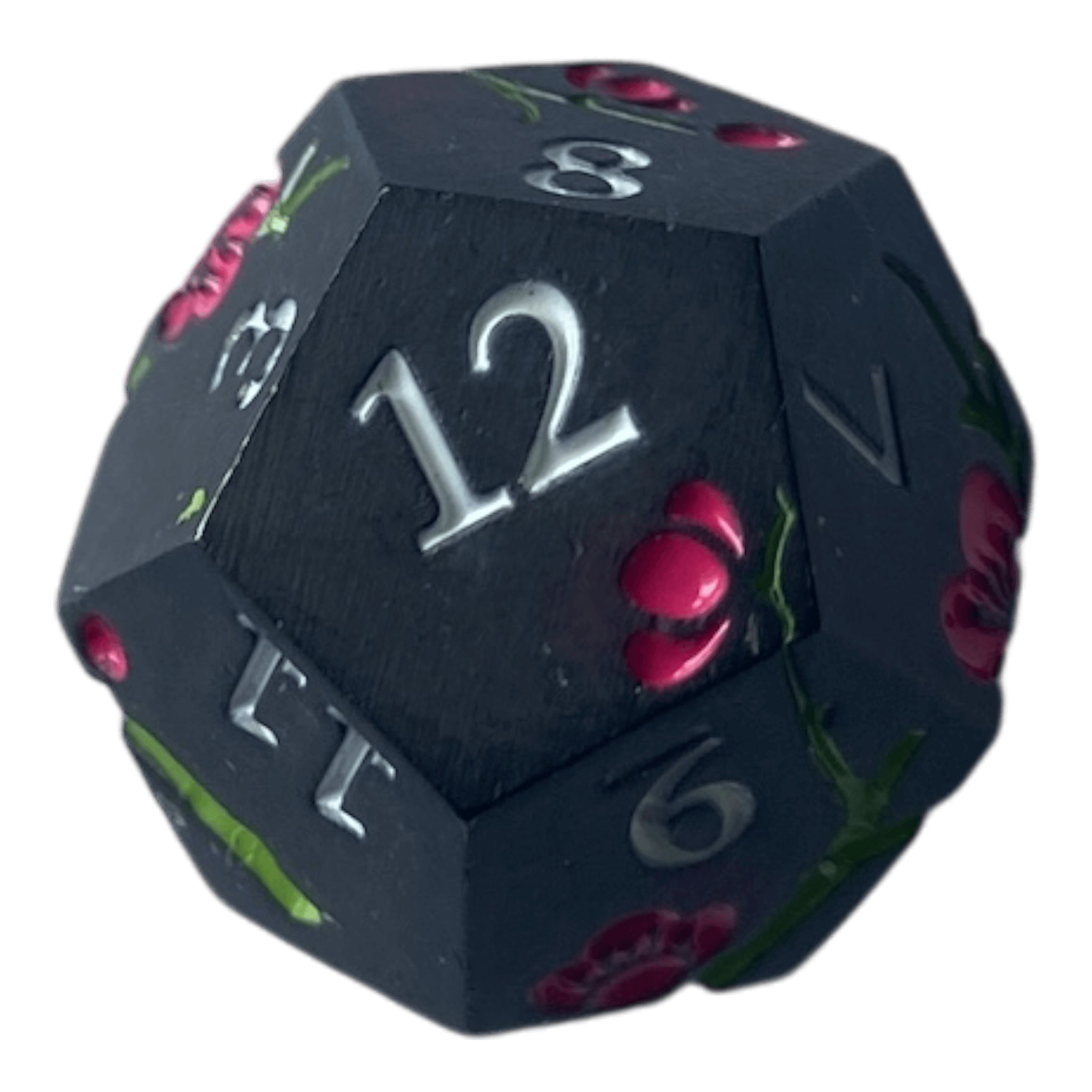 Ideal für Rollenspiele, Tabletop-Games oder als exklusives Sammlerstück – der W12 Blumen Metallwürfel in Schwarz vereint florale Schönheit und hochwertige Verarbeitung.