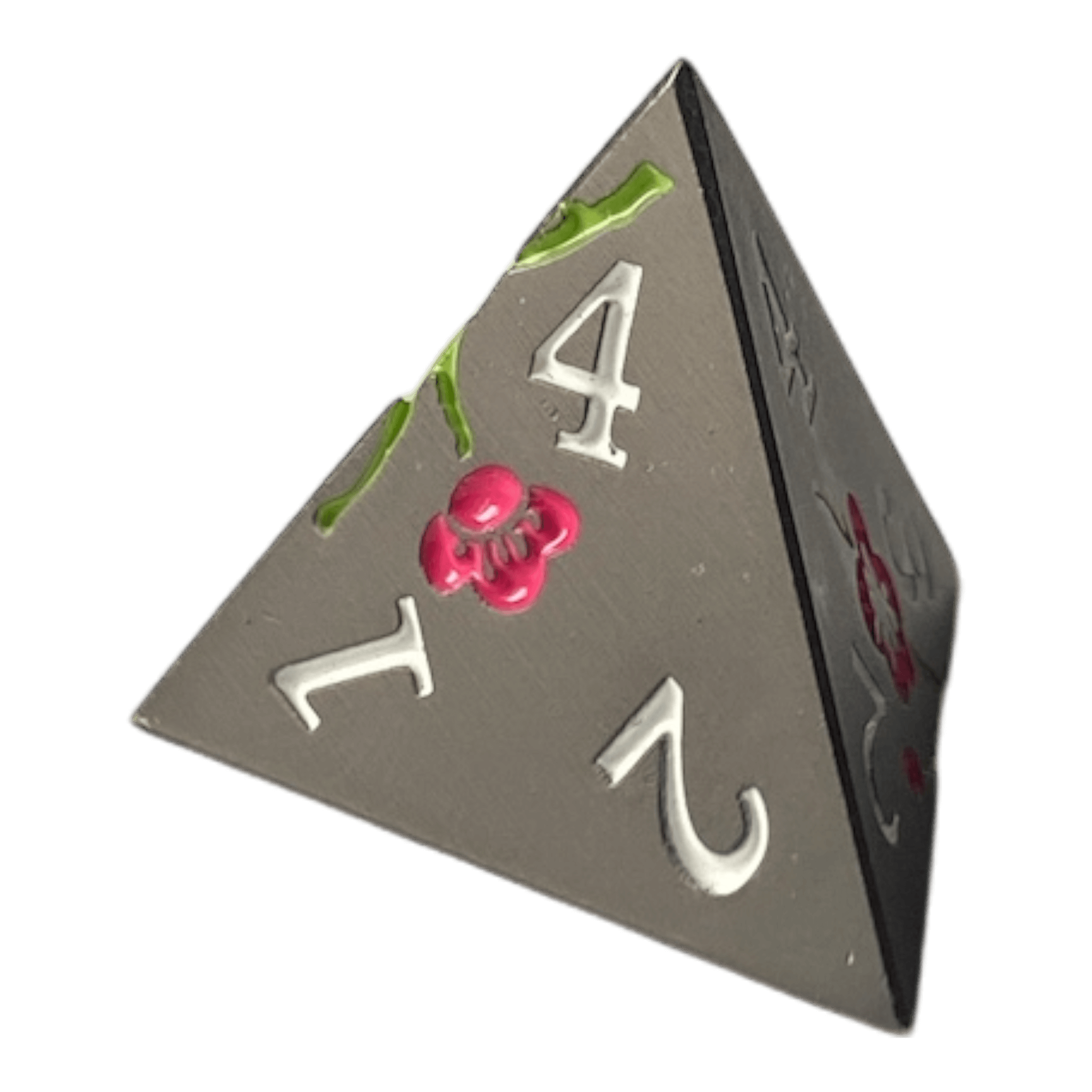 Perfekt für Rollenspiele, Tabletop-Games oder als besonderes Sammlerstück – der W4 Blumen Metallwürfel in Schwarz vereint florale Eleganz mit robuster Verarbeitung.