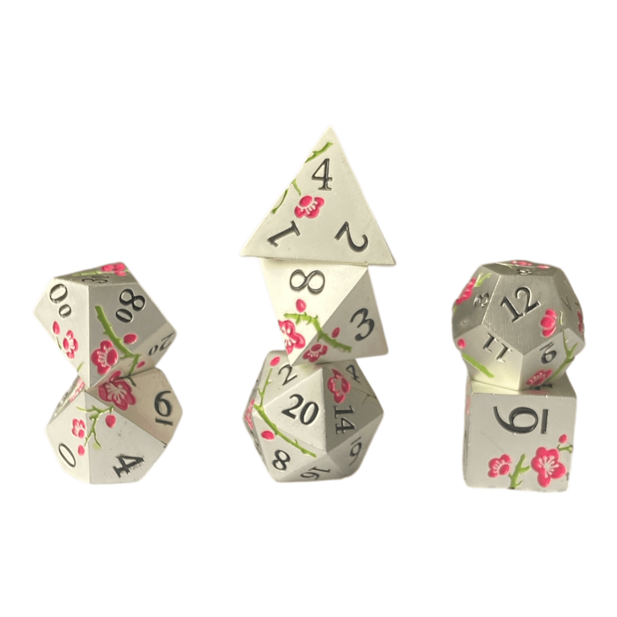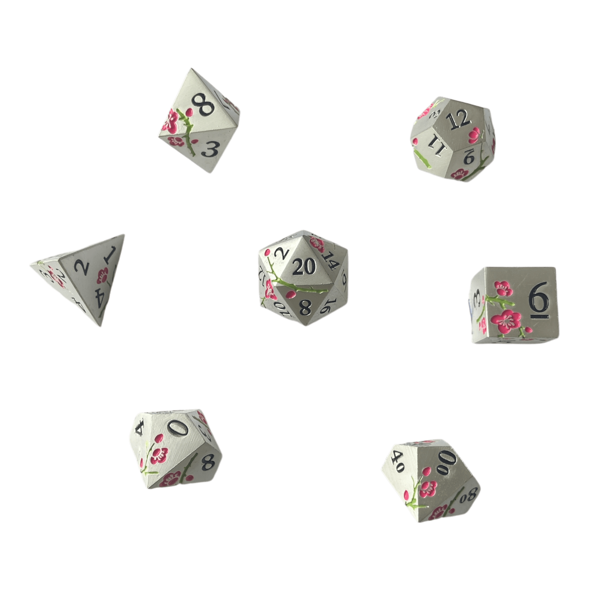 Das Magnolia Würfelset in Silber bietet eine harmonische Mischung aus floralen Motiven und eleganter Metallverarbeitung. Jeder Metallwürfel im Set ist in ein strahlendes Silber gehüllt und mit kunstvoll gestalteten pinken Blumen verziert, die sich über die gesamte Oberfläche ziehen. Die Kombination aus dem lebendigen Blumendesign und der robusten Verarbeitung sorgt für langlebige Stabilität und präzise Würfelergebnisse.