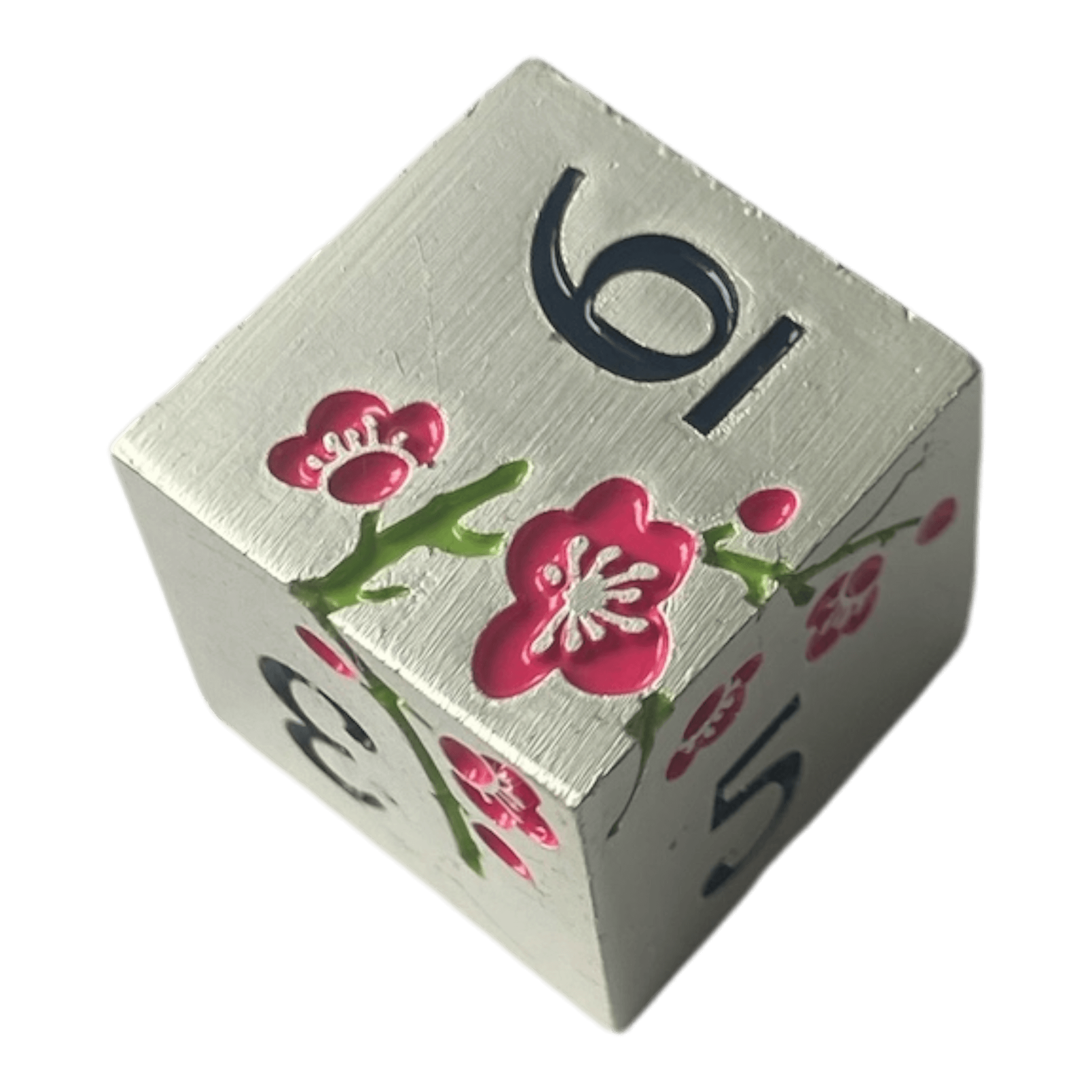 Der W6 Magnolia Metallwürfel in Silber verbindet florale Eleganz mit solider Verarbeitung. Die leuchtenden pinken Blumen erstrecken sich kunstvoll über die glänzende silberne Oberfläche des Würfels und schaffen eine einzigartige optische Tiefe. Die robuste Metallverarbeitung sorgt für eine lange Haltbarkeit und präzise Würfelergebnisse, die auch bei intensiven Spielrunden überzeugen.