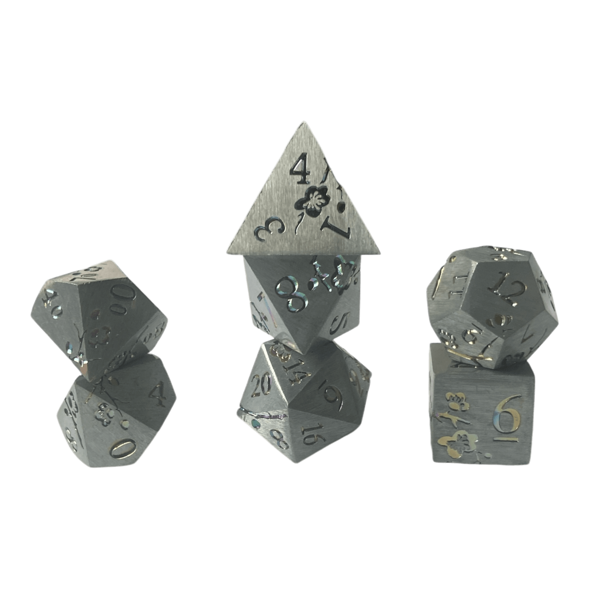 Die Blumen Metallwürfel in Silber kombinieren zeitlose Eleganz mit lebendigen Farbakzenten. Jede Seite der Metallwürfel ist kunstvoll mit regenbogenfarbenen Blumen verziert, die sich über die gesamte Oberfläche ziehen und den Würfeln eine faszinierende Tiefe verleihen. Die regenbogenfarbenen Nummern fügen sich nahtlos in das Design ein und sorgen für eine klare Lesbarkeit. Dank der robusten Metallverarbeitung garantieren diese Blumen Metallwürfel langlebige Stabilität und präzise Würfelergebnisse.